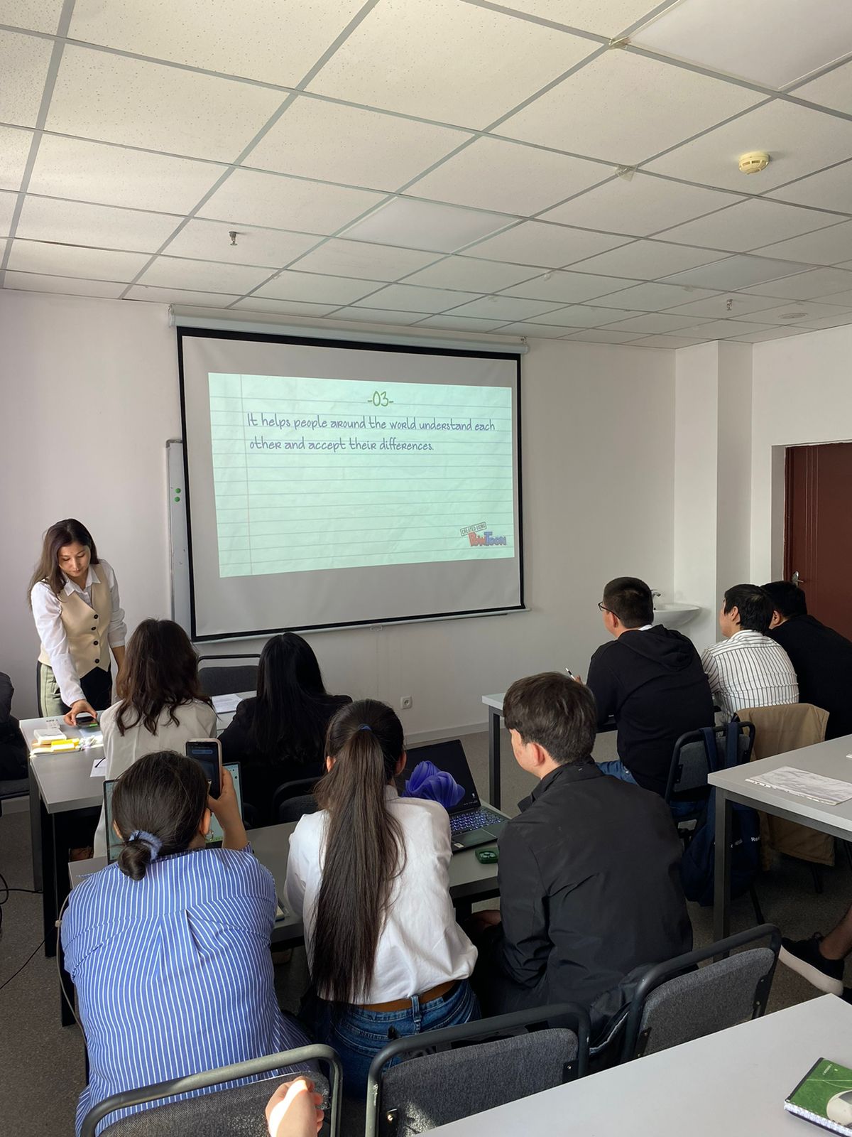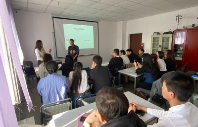 Дәріс барысында шетелдік маман Running dictation, яғни TPR әдісін қолданып, студенттердің белсенділігін арттырып, ағылшын тілін қимыл арқылы үйретуді көрсетті.