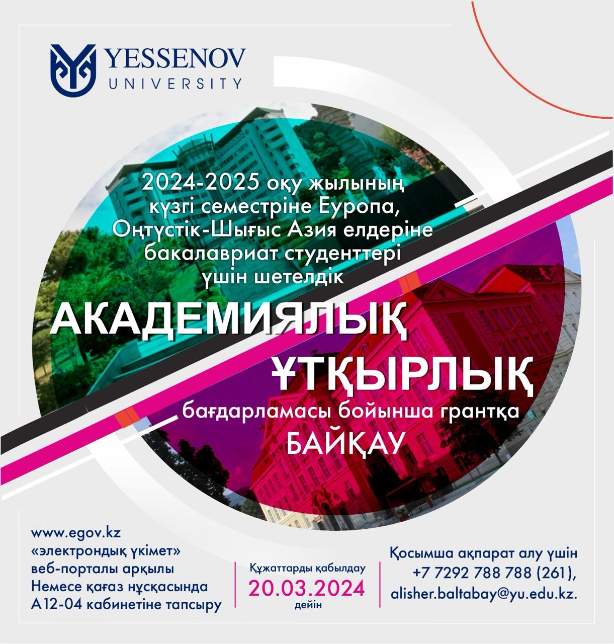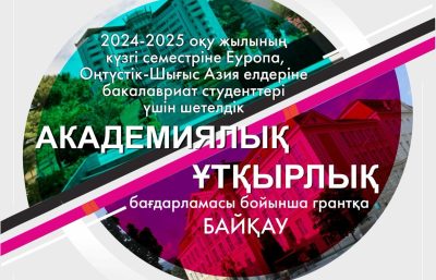 2024-2025 оқу жылының күзгі семестріне Еуропа, Оңтүстік-Шығыс Азия елдеріне бакалавриат студенттері үшін шетелдік академиялық ұтқырлық бағдарламасы бойынша грантқа байқау жарияланады!