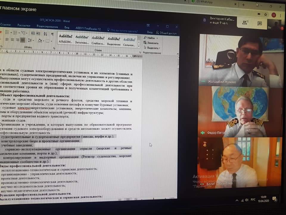 Оған кәсіби стандарттарды әзірлеушілер, жұмыс берушілер, Болон процесі орталығы, «Теңіз техникасы және технологиялары» кадрлар даярлау бағыты бойынша республикалық оқу-әдістемелік бірлестігінің мүшелері қатысты. Жалпы білім беру бағдарламасын талқылау кезінде онлайн-кеңес қонақтарының ескертулері ескерілді,олардың пысықтаулары ескерілді және орындалатын болады, сонымен қатар жалпы бі.