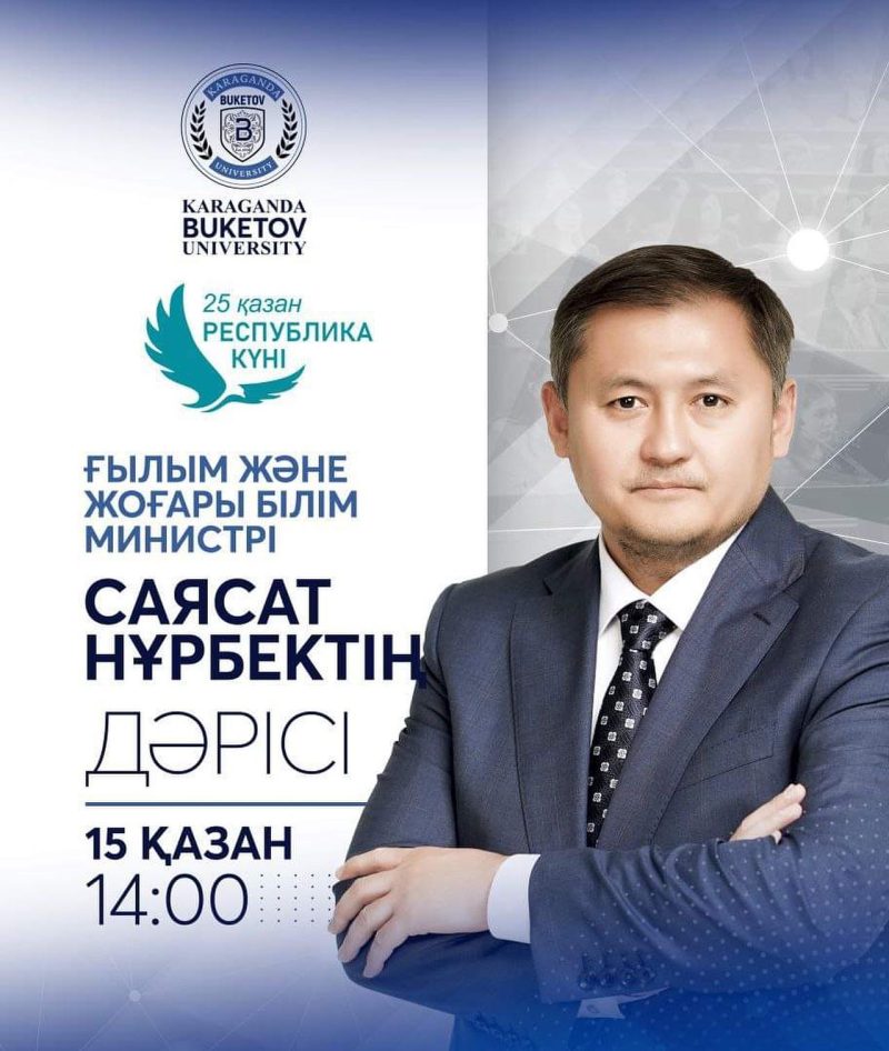 15 қазан күні ҚР Ғылым және жоғары білім министрі Саясат Нұрбек «Сандық трансформация заманындағы дағдылар мен компетенциялар» тақырыбында дәріс оқыды. Бұл дәрісті тыңдауға студенттер Атриум залына жиналып, онымен қоса, онлайн форматта тыңдауға да асыға қатысты.