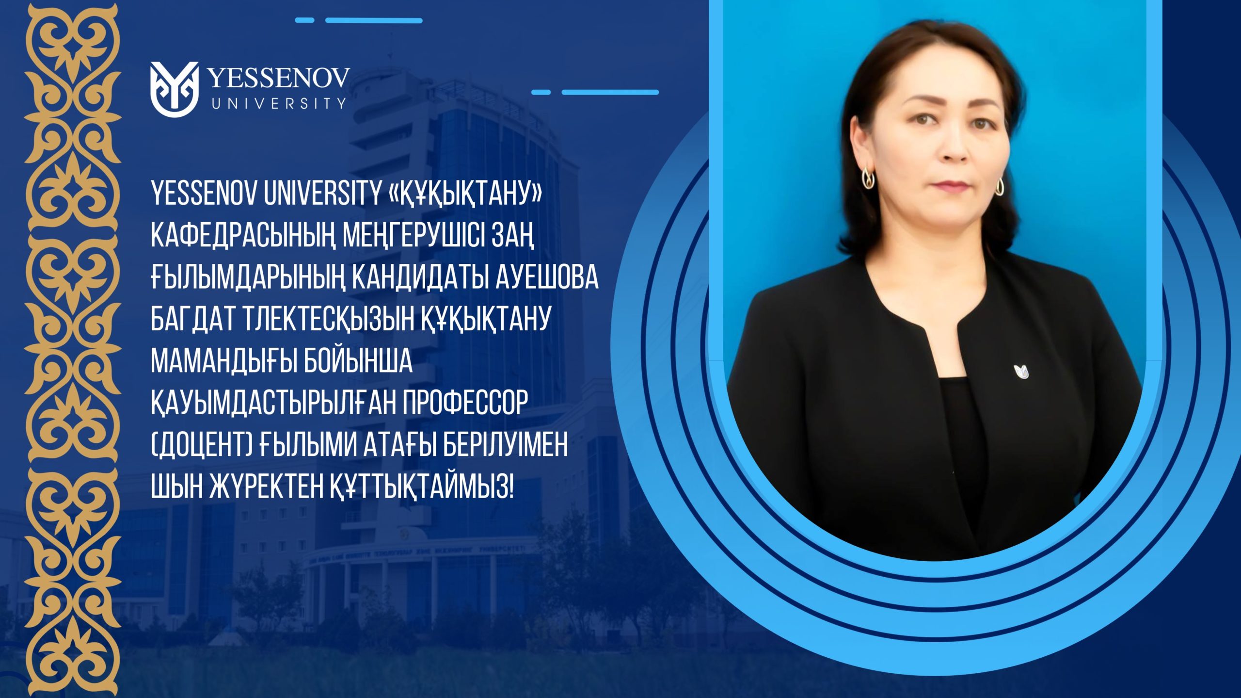 Yessenov University congratulates the Head of the Department «Jurisprudence», Candidate of Juridical Sciences Aueshova Bagdat Tlektesovna with the conferment of the academic title ASSOCIATE PROFESSOR (Assistant Professor) by specialty 12.00.00 – Jurisprudence according to the Order of the Chairman of the Committee on Quality Assurance in Education and Science of the Ministry of Education and Science of the Republic of Kazakhstan 498 of June 16, 2021.