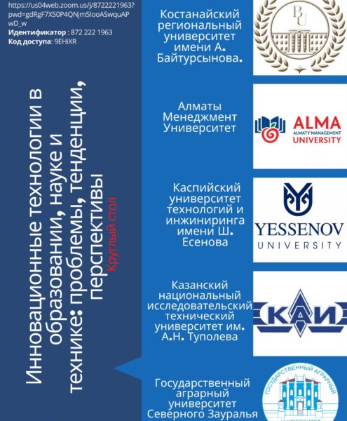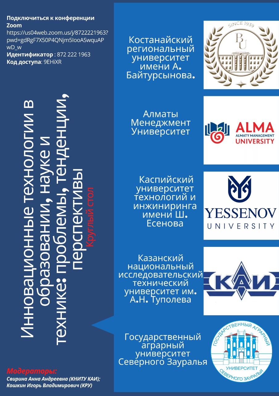 On 27.04.2021, a round table was held in an online format on the topic “Innovative technologies in education, science and technology: problems, trends, prospects” within the framework of the international project UXiship (Activization of competencies of students of ICT specialties in the development of startups using interdisciplinary module courses in educational programs of universities), organized by the Kostanay Regional University named after A. Baitursynov and Kazan National Research Technical University.