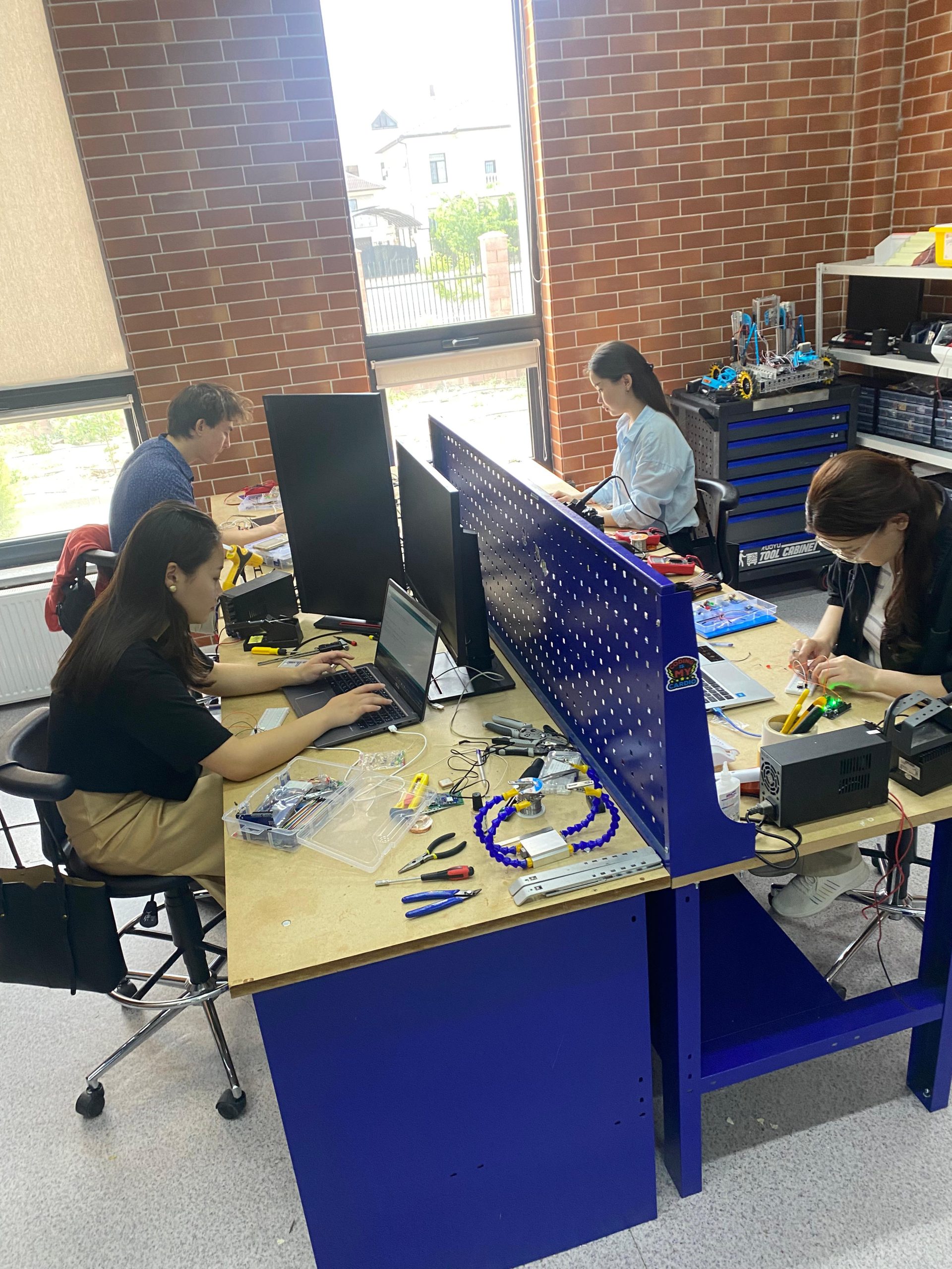 2. “Basics of Robotics” – participants get acquainted with robot construction, study the basics of electronics and programming, and also implement their own technical projects. Course instructor — robotics specialist Yrysjan Serikovich Sanzysbay.