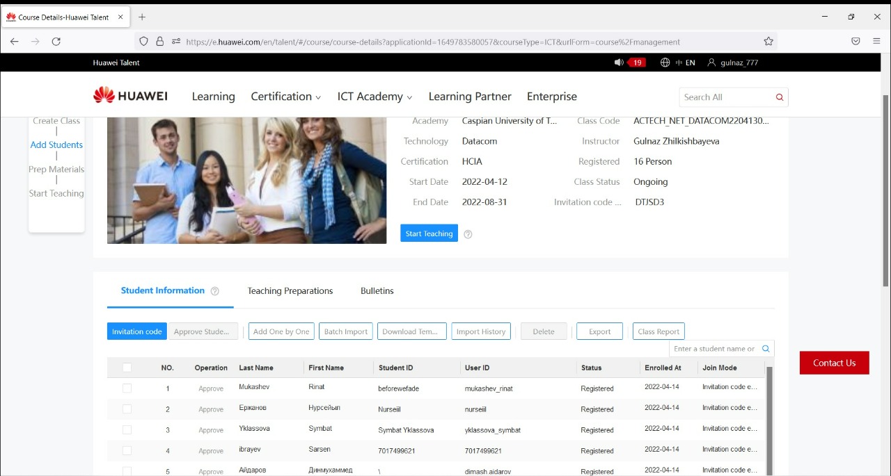 Huawei «Data Communication» ағымдағы курсына тіркелу басталды. «6B06102-Сomputer engineering» және «6В06103-Есептеу техникасы және бағдарламалық қамтамасыз ету» білім беру бағдарламалары бойынша оқитын елуден астам студент тіркеліп, осы курстың материалын оқуға кірісті. «Деректердің байланысы» курс бағдарламасы деректер желілерін құру және жабдықты пайдалану туралы кәсіби деңгейде білім алғысы келетін мамандарға бағытталған.