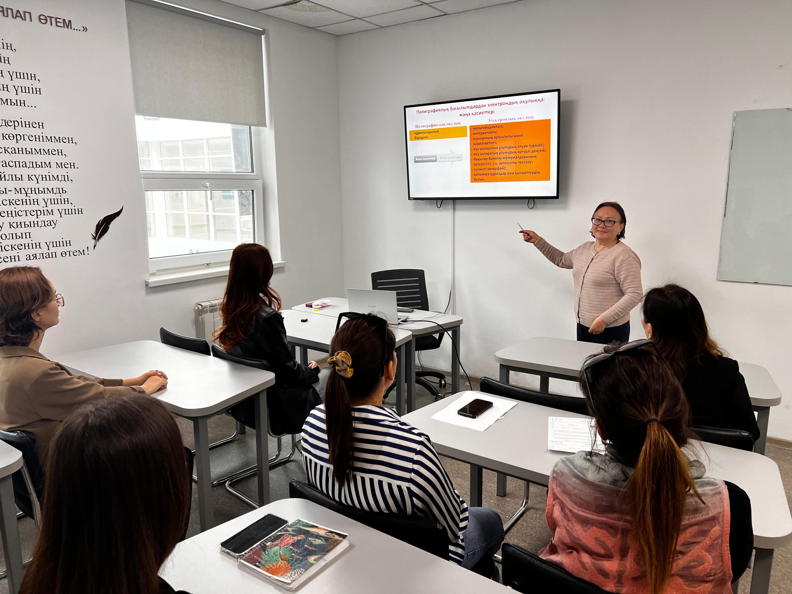 The classes were conducted in the format of lectures, practical workshops, and group discussions by Faouzia Toleushaikhovna Sametova, Candidate of Philological Sciences and Professor of the “World Languages” Department of the “Tourism and Languages” Faculty. During the training, participants had the opportunity to develop their own educational material projects, which were subsequently evaluated by experts.