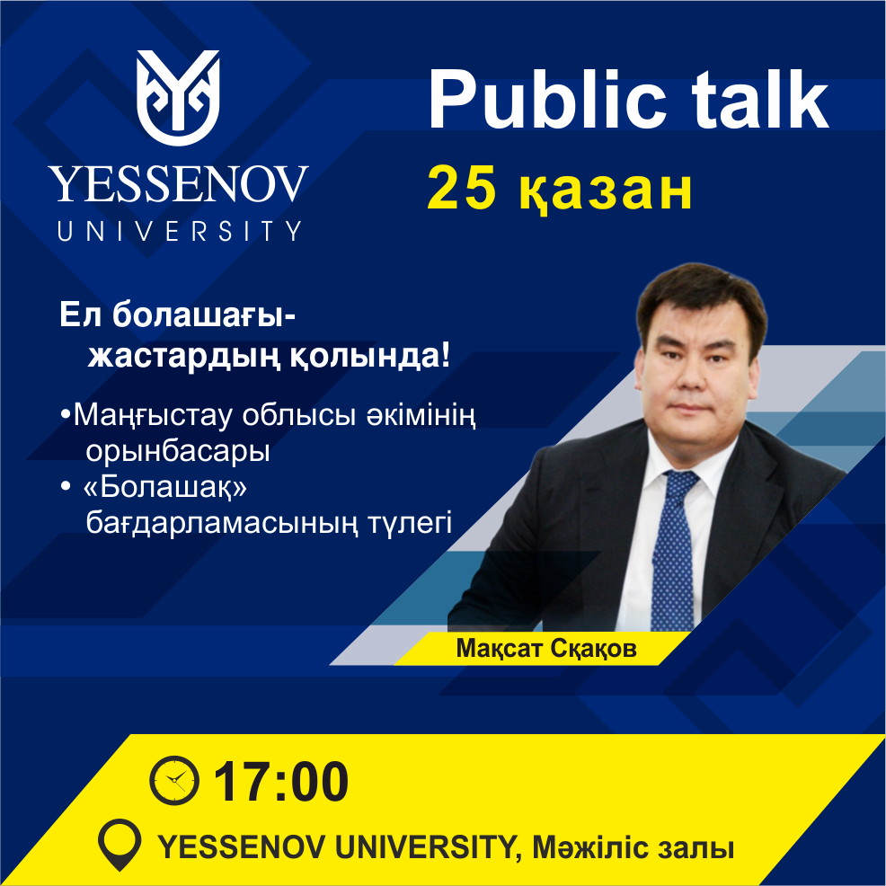 25 қазан күні сағат 17:00-де Yessenov University бас ғимаратының Мәжіліс залында #PublicTalk жобасы аясында Маңғыстау облысы әкімінің орынбасары, «Болашақ» бағдарламасының түлегі Мақсат Нұрлыбекұлы Сқақовпен кездесу болады. Студенттерді және оқытушыларды белсенділік танытып, аталған шараға қатысуға шақырамыз!