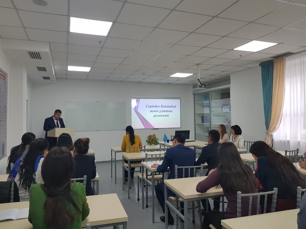 «Педагогика» факультетінде «Қазақ филологиясы» кафедрасының ұйымдастырумен «С.Қондыбай және ұлттық руханият» тақырыбында дөңгелек үстел өтті. Шара «Қазақ филологиясы» кафедрасының профессоры Жоламан Қоблановтың кіріспе сөзімен басталды. Кафедра меңгерушісі Ақмарал Отарова, профессор Бибайша Нұрдәулетова және магистр Гүлдана Алтыбаевалар қатысты.