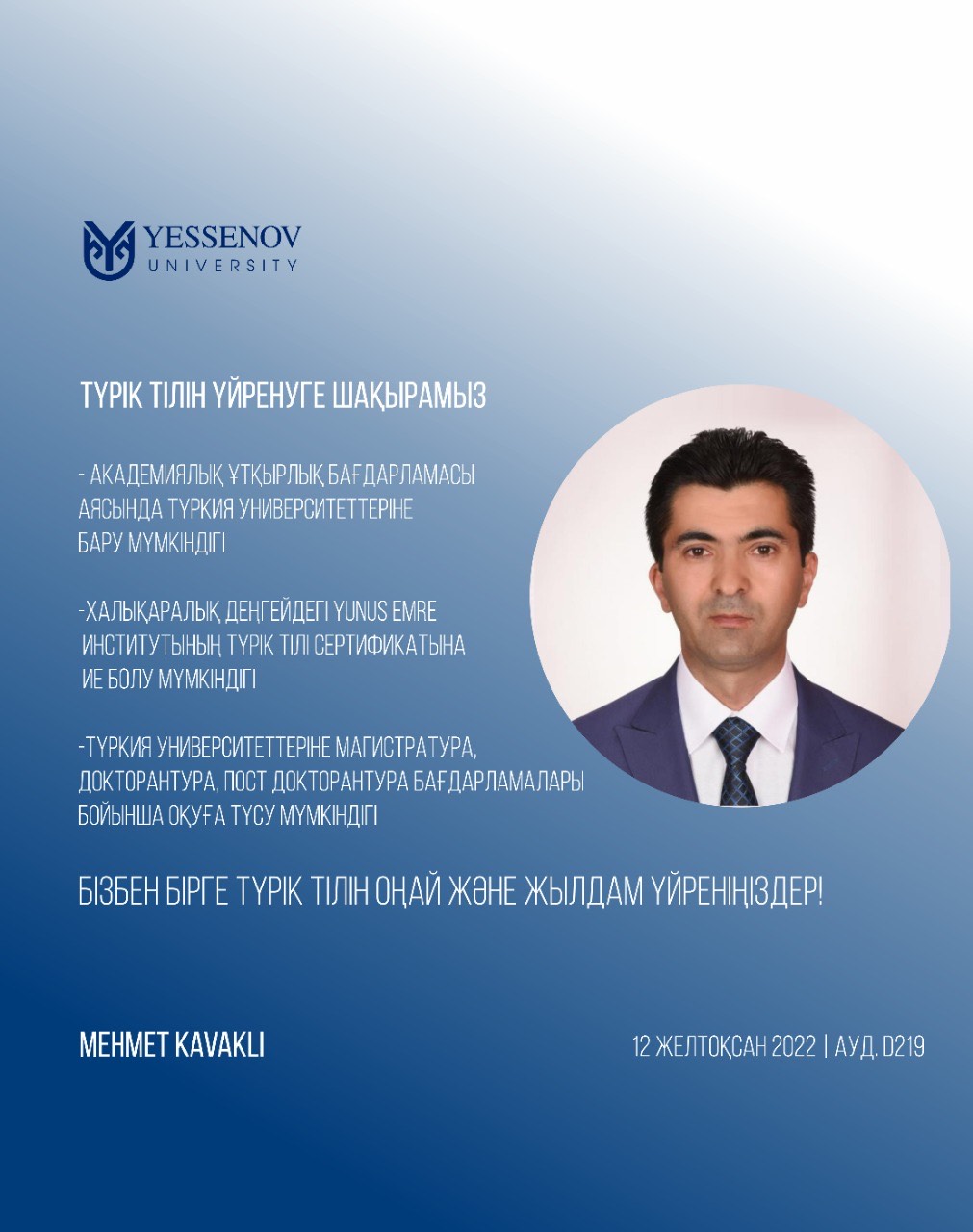 Орны: Yessenov University ғимараты, D219 аудиториясы