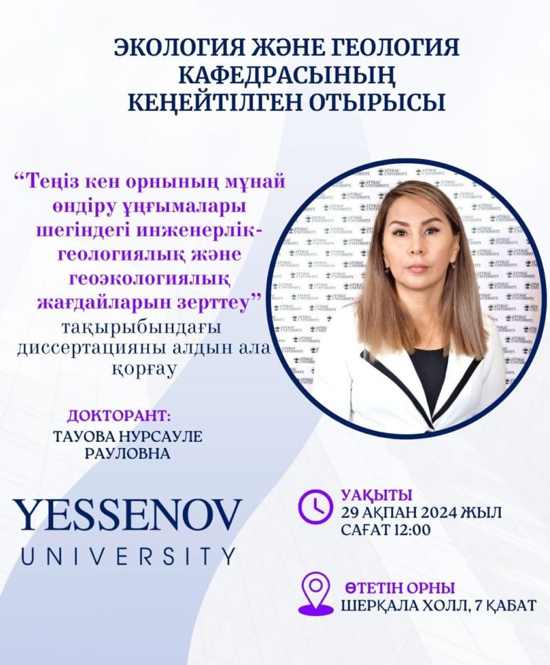 On February 29, 2024, at an expanded meeting of the Department of Ecology and Geology of the Yesenov University, a preliminary defense of the doctoral dissertation of a doctoral student in the educational program 8d07208 – Geology and exploration of mineral deposits by Tauova Nursaule Raulovna for the degree of Doctor of Philosophy on the topic “Study of engineering-geological and geoecological conditions within the oil wells of the Tengiz field. We invite you to take part!.