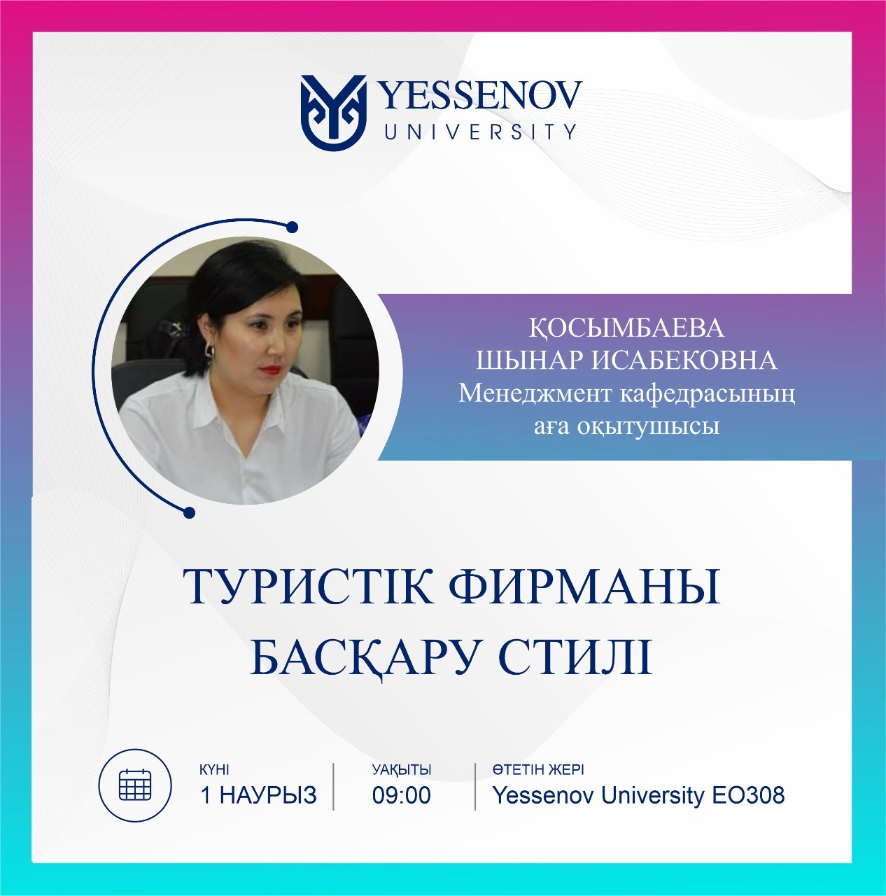 1 наурыз күні сағат 09:00 де «Менеджмент» кафедрасының аға оқытушысы Қосымбаева Шынар Исабековнаның «Туризм менеджменті» пәнінен «Туристік фирманы басқару стилі» тақырыбында ашық дәріс сабақ өткізеді.