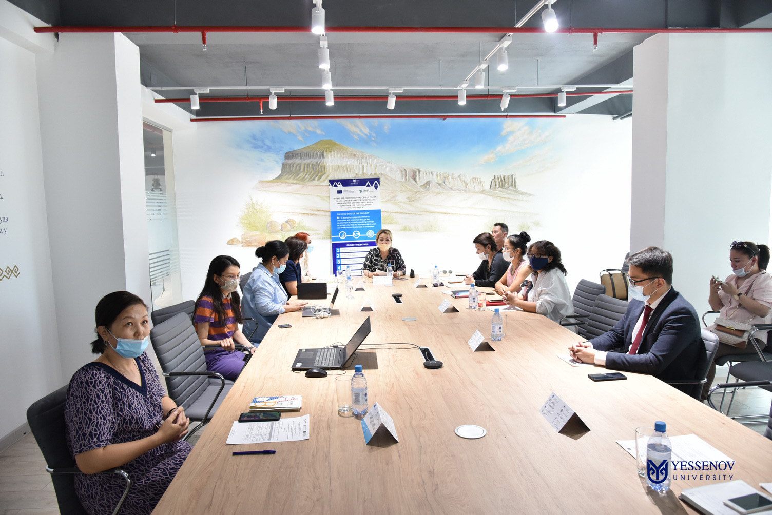 The event was attended by Head of Business and Trade Administration Zhanna Tokbaeva, Deputy Director of the Chamber of Entrepreneurs of Mangistau Region Aitzhanova Akku, Deputy Head of the Department of Investment and Tourism Development of the Mangistau Region Nuradil Imagaliev, Director of the Public Association «Expedition 362» Erlan Jumaev, European Partner (Italy) in person of Professor of the University of Bologna Massimo Bianchi, Vice-Chancellor of International Business University Anar Mahmetova and Yessenov University project team.