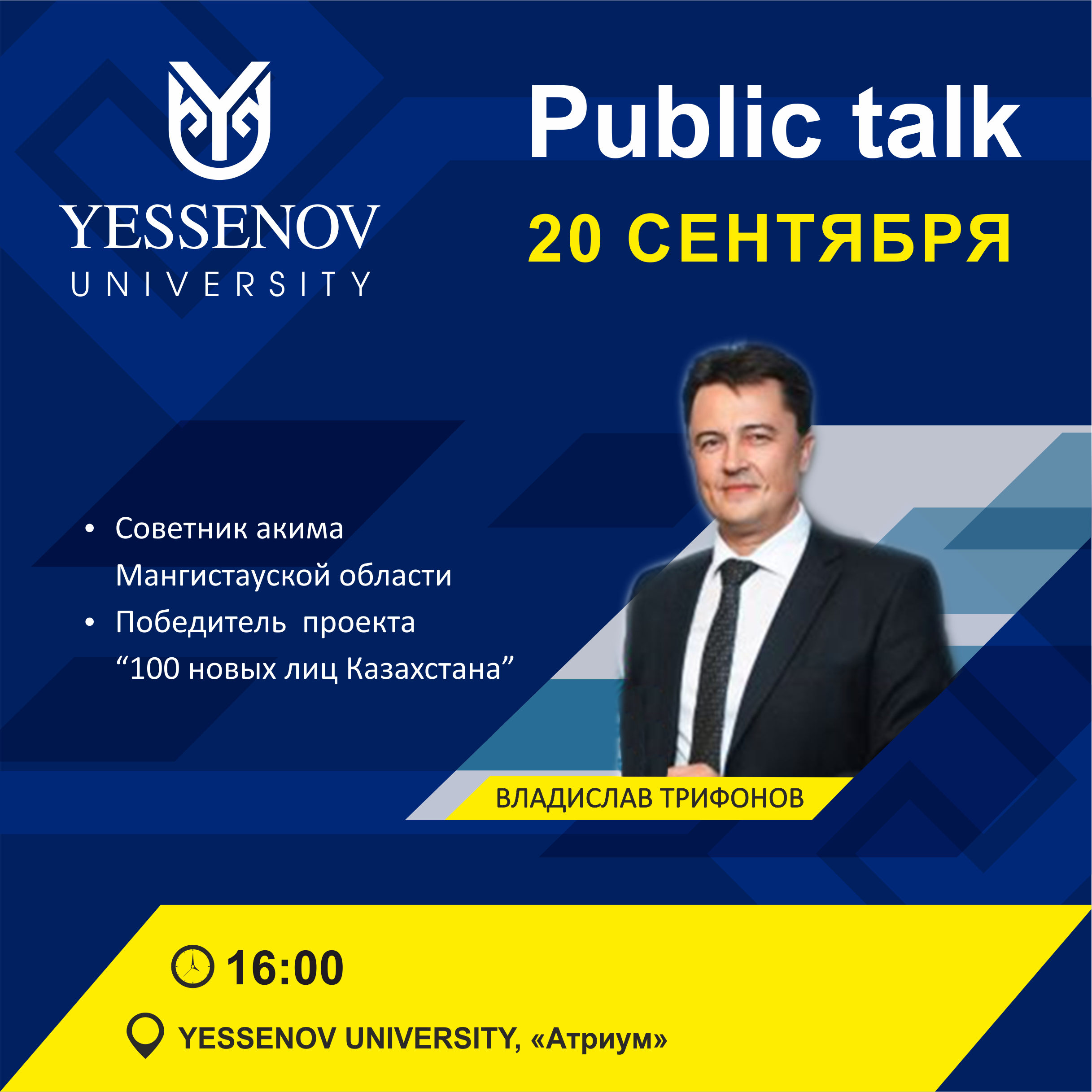 20 қыркүйек күні сағат 16:00-де Yessenov University бас ғимаратының Атриум залында #PublicTalk жобасы аясында «Қазақстанның 100 жаңа есімі» жобасының жеңімпазы, Маңғыстау облысы әкімінің кеңесшісі Владислав Трифоновпен кездесу болады.  Студенттерді және оқытушыларды белсенділік танытып, аталған шараға қатысуға шақырамыз!