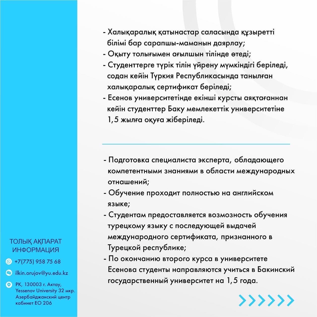 Yessenov University және Баку мемлекеттік университетімен бірлескен жаңа қос дипломды Халықаралық қатынастар мамандығы бойынша құжат қабылдау басталғандығын жариялаймыз!