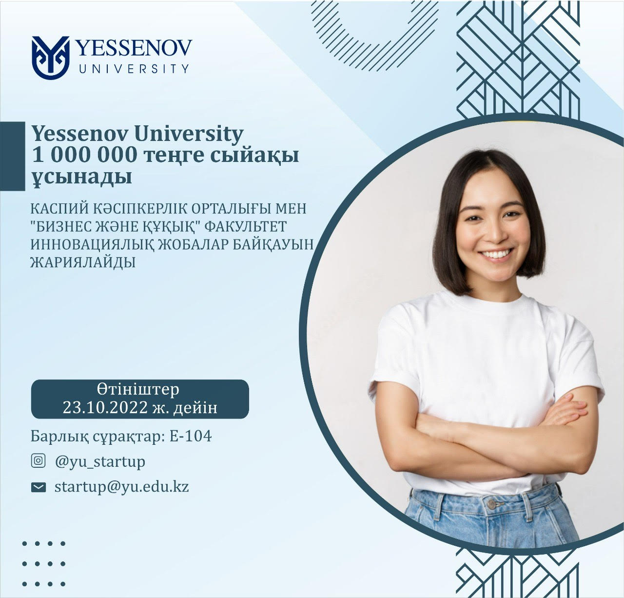 Барлық сұрақтар бойынша: E-104 аудиториясы және @yu_startup