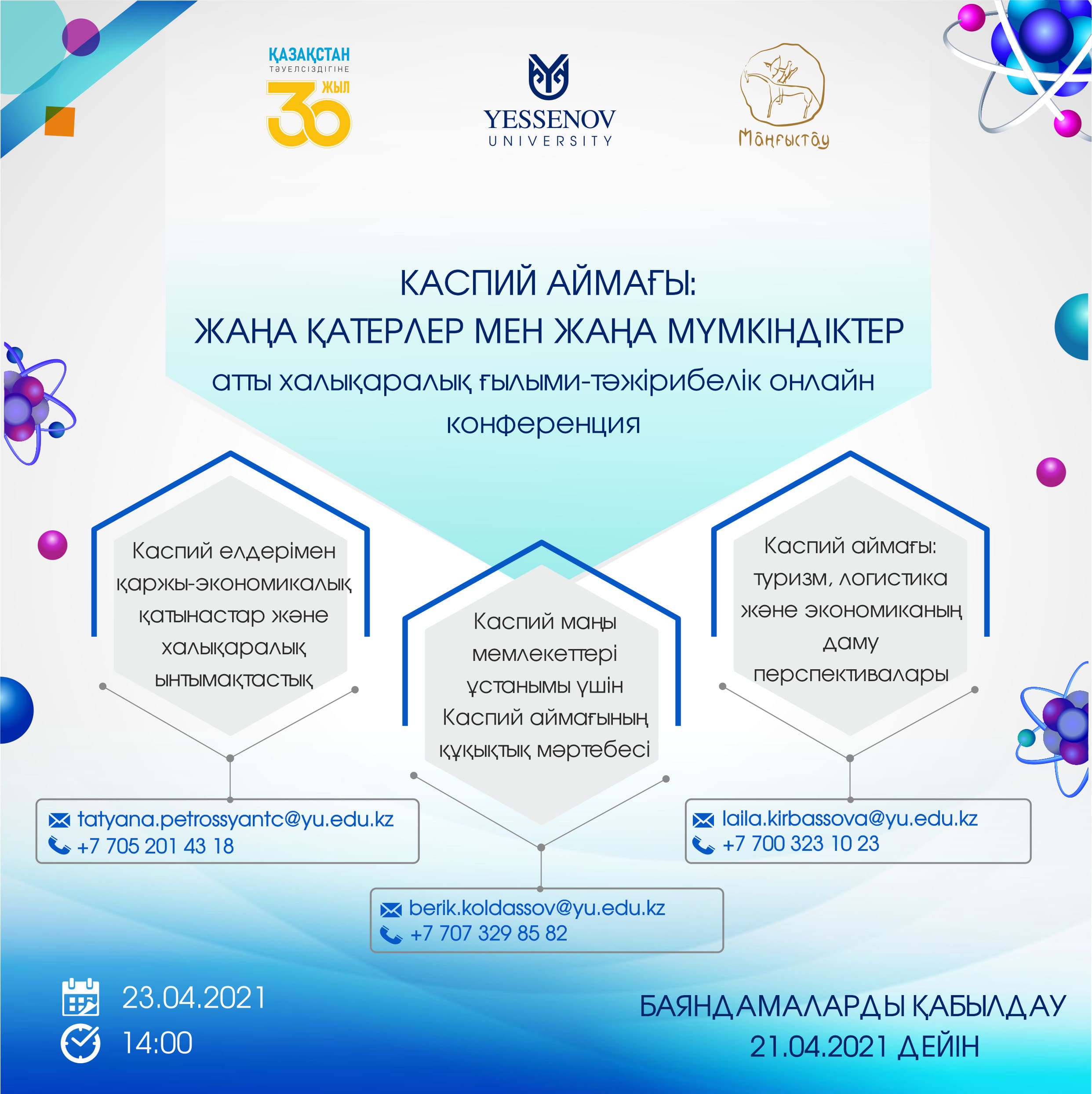 Yessenov University Сіздерді «Каспий аймағы: жаңа қатерлер мен жаңа мүмкіндіктер» атты халықаралық ғылыми-тәжірибелік онлайн конференцияға қатысуға шақырады.