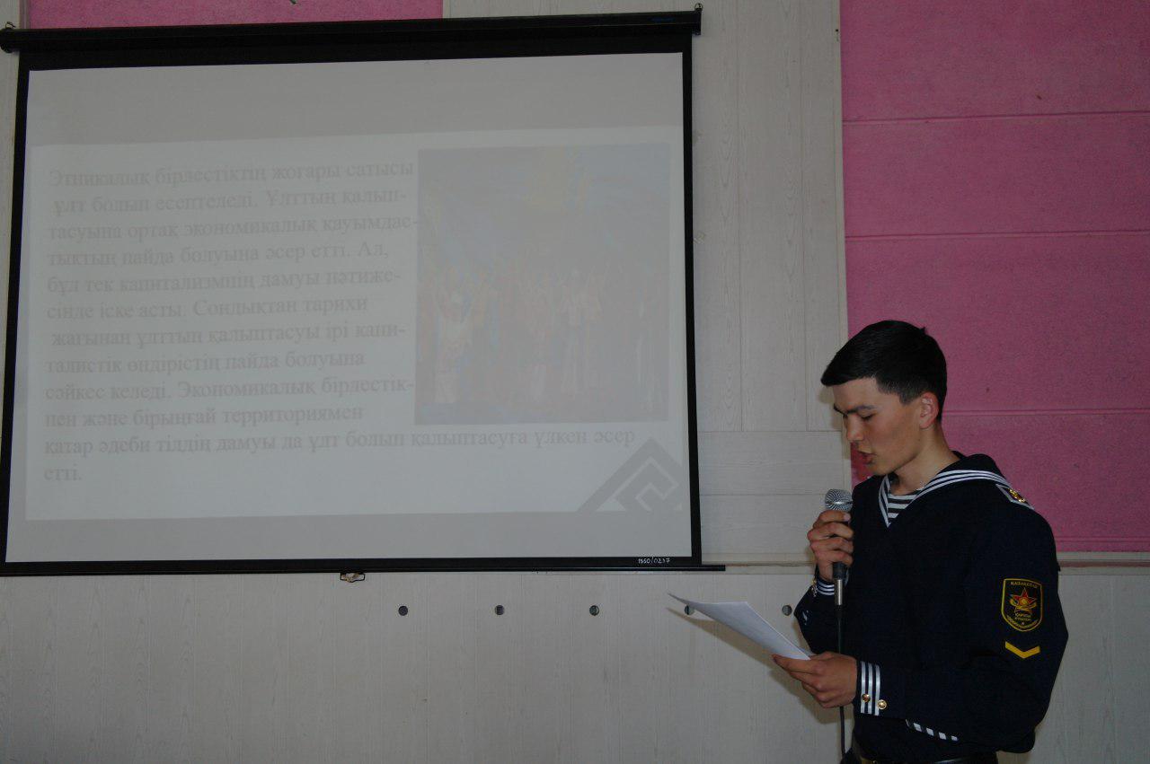 Шарада курсант Темирханов Азамат дайындаған «Бір тұтас Маңғыстау халқы» атты презентациясы көрсетілді.