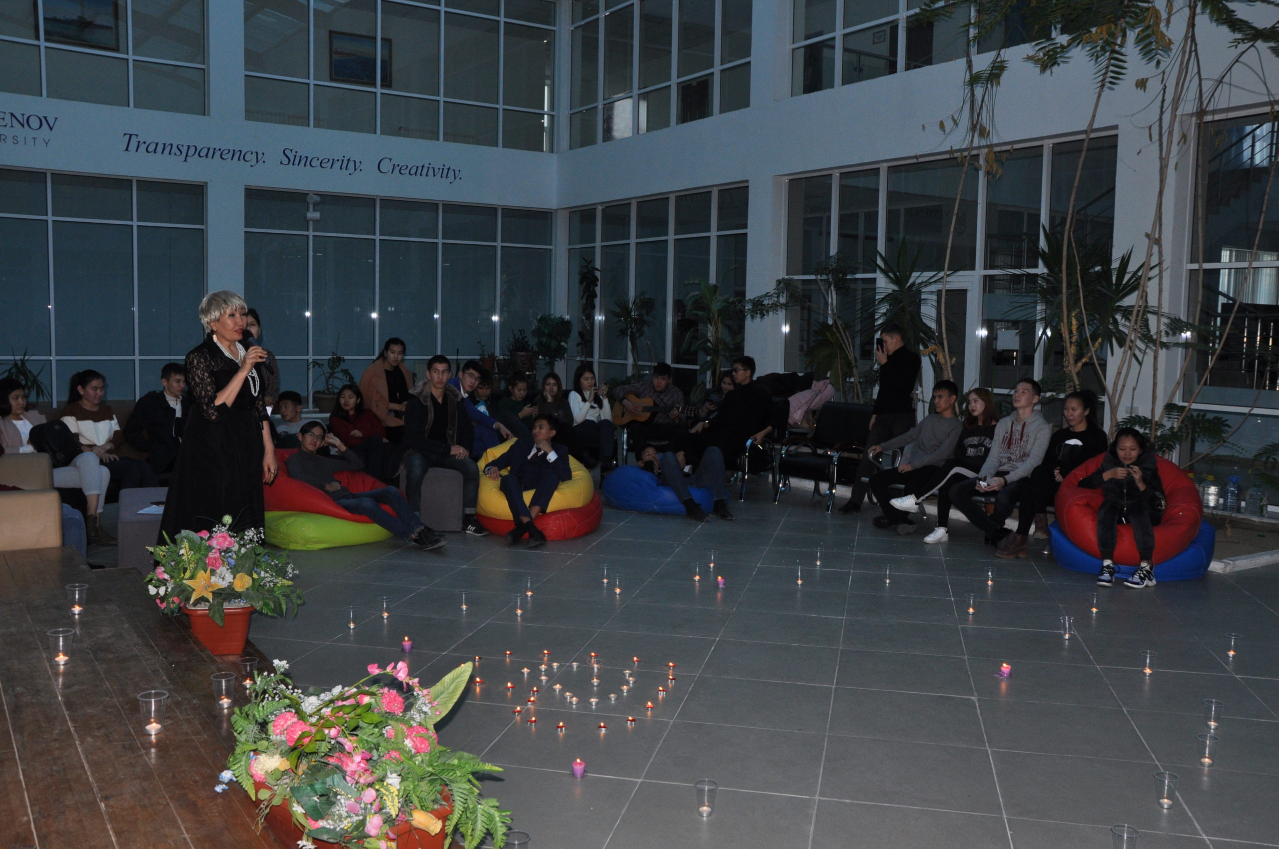«Қазақстан Халқы Ассамблеясының» кафедрасының оқытушылары И.В. Бисингалиева және А.Б. Толепбергенованың ұйымдастыруымен “Махаббат әлемі” атты студенттер арасында поэзиялық кеш өтті. Іс-шараның мақсаты: студенттерге адамгершілік-рухани тәрбие беру, өзара қарым-қатынастағы сыйластықты ұғындыру, сүйіспеншілік қасиеттері туралы түсінік беру. Бір- біріне деген сыйластық сезімін құрметтеуге шақыру. Студенттер әртүрлі тақырыпта өз өлеңдерін оқыды. Іс шараның соңында студенттерге тренинг өткізілді.