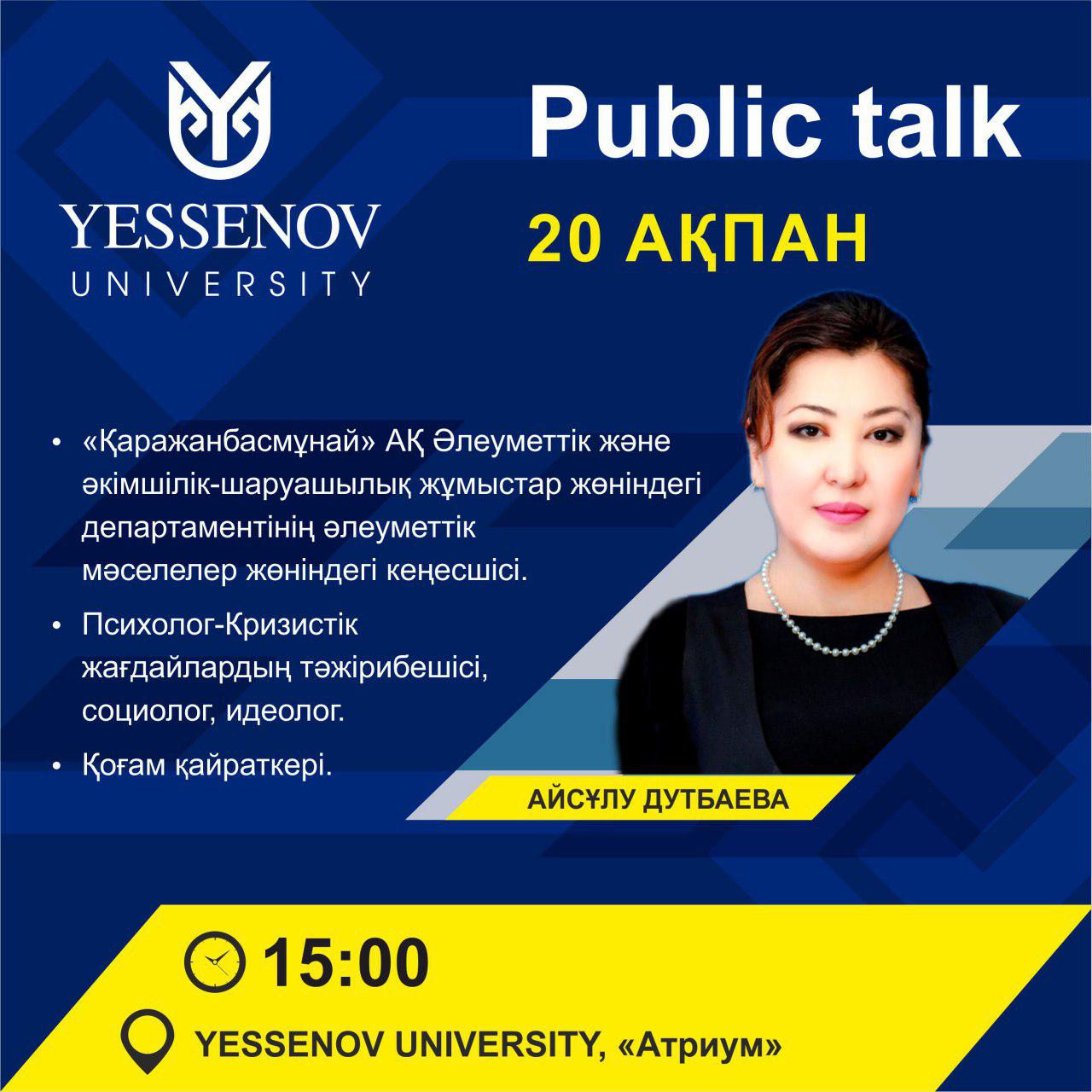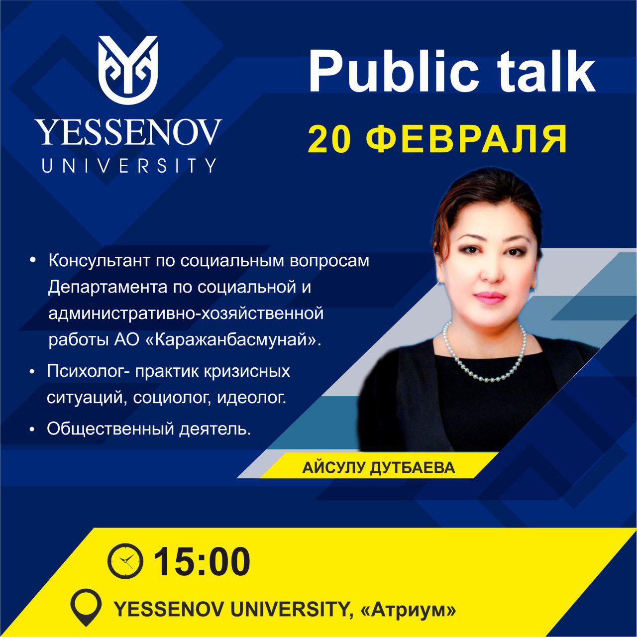 20 ақпан күні сағат 15:00-де Yessenov University бас ғимаратының Атриум залында #PublicTalk жобасы аясында, «Қаражанбасмұнай» АҚ Әлеуметтік және әкімшілік-шаруашылық жұмыстар жөніндегі департаментінің әлеуметтік мәселелер жөніндегі кеңесшісі Айсұлу Дутбаевамен кездесу болады. Студенттерді және оқытушыларды белсенділік танытып, аталған шараға қатысуға шақырамыз!