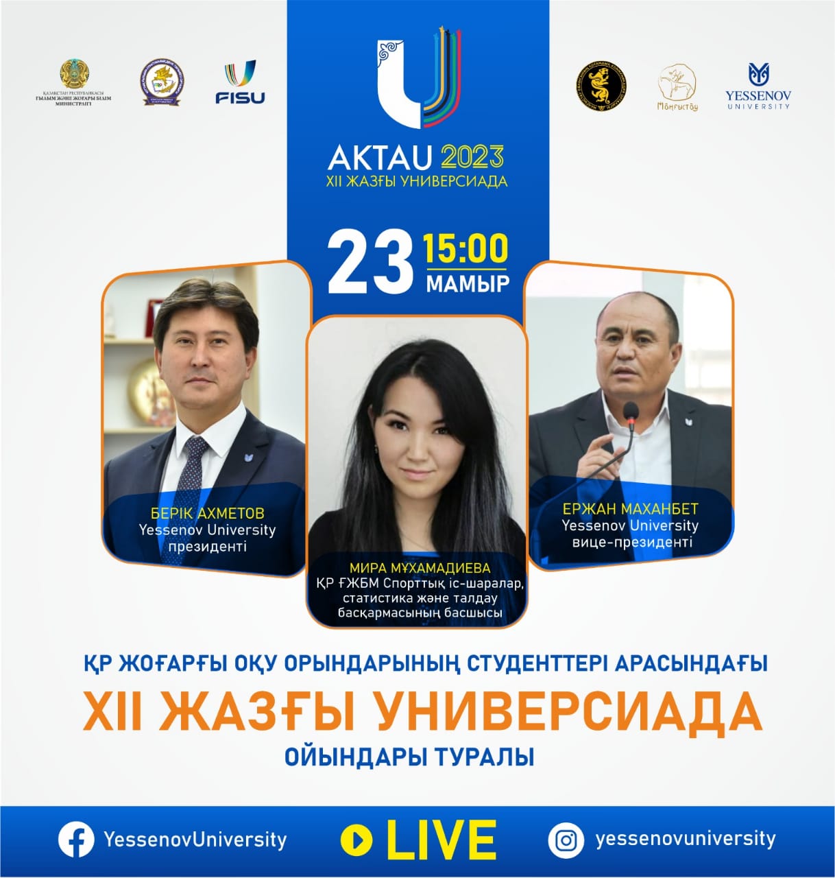 23 мамыр күні сағат 15:00-да ҚР ҒЖБМ спорттық іс-шаралар, статистика және талдау басқармасының басшысы Мира Мұхамадиева және Yessenov University президенті Берік Ахметов пен Yessenov University вице-президенті Ержан Маханбет тікелей эфирге шығып, журналистердің сұрақтарына жауап береді.