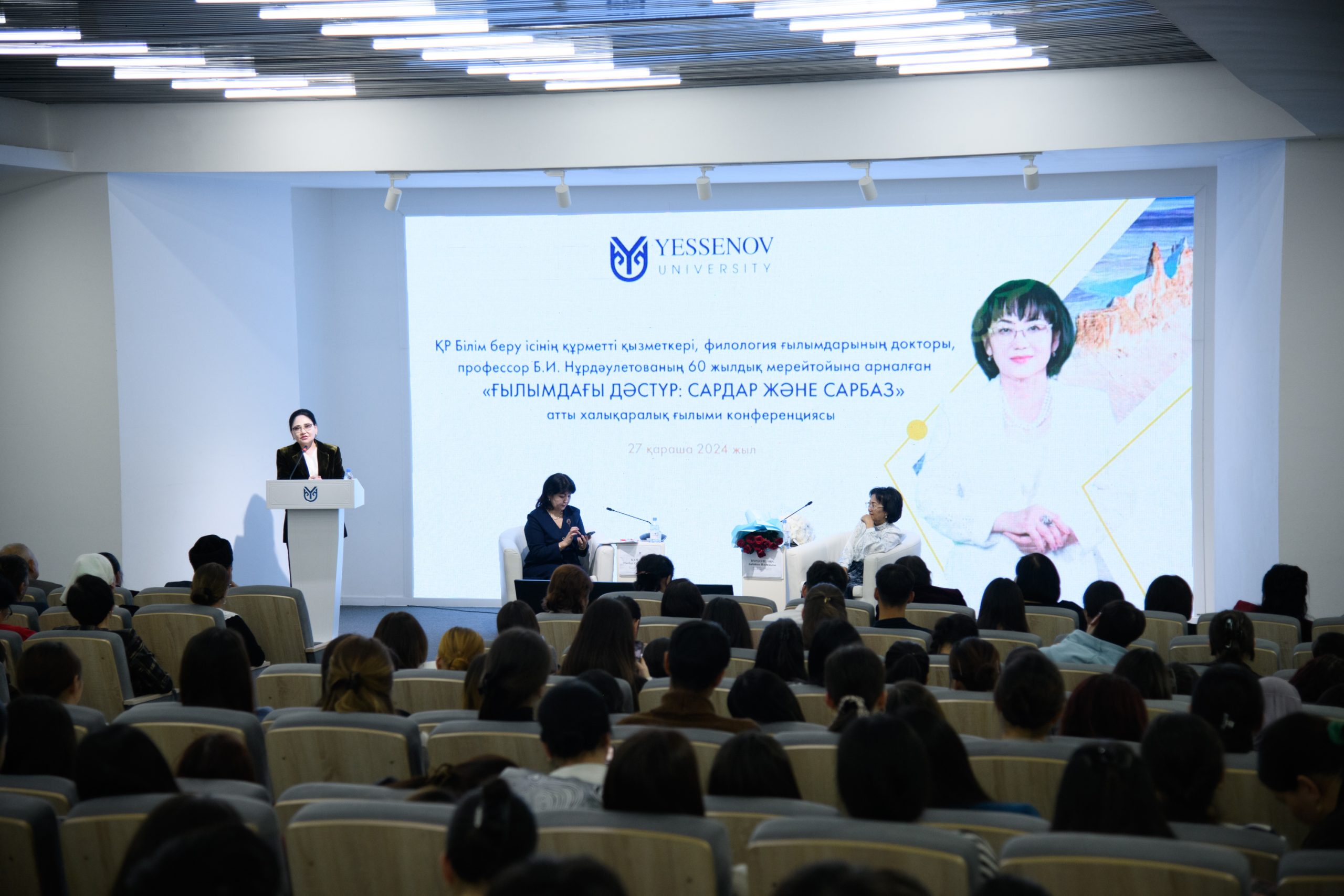 27 ноября в Yessenov University состоялась международная научная конференция, посвящённая 60-летнему юбилею профессора, доктора филологических наук, заслуженного работника образования Республики Казахстан Бибайши Ильясовны Нурдаулетовой и прошла в формате международной научно-практической конференции на тему «Научные традиции: предводители и последователи».