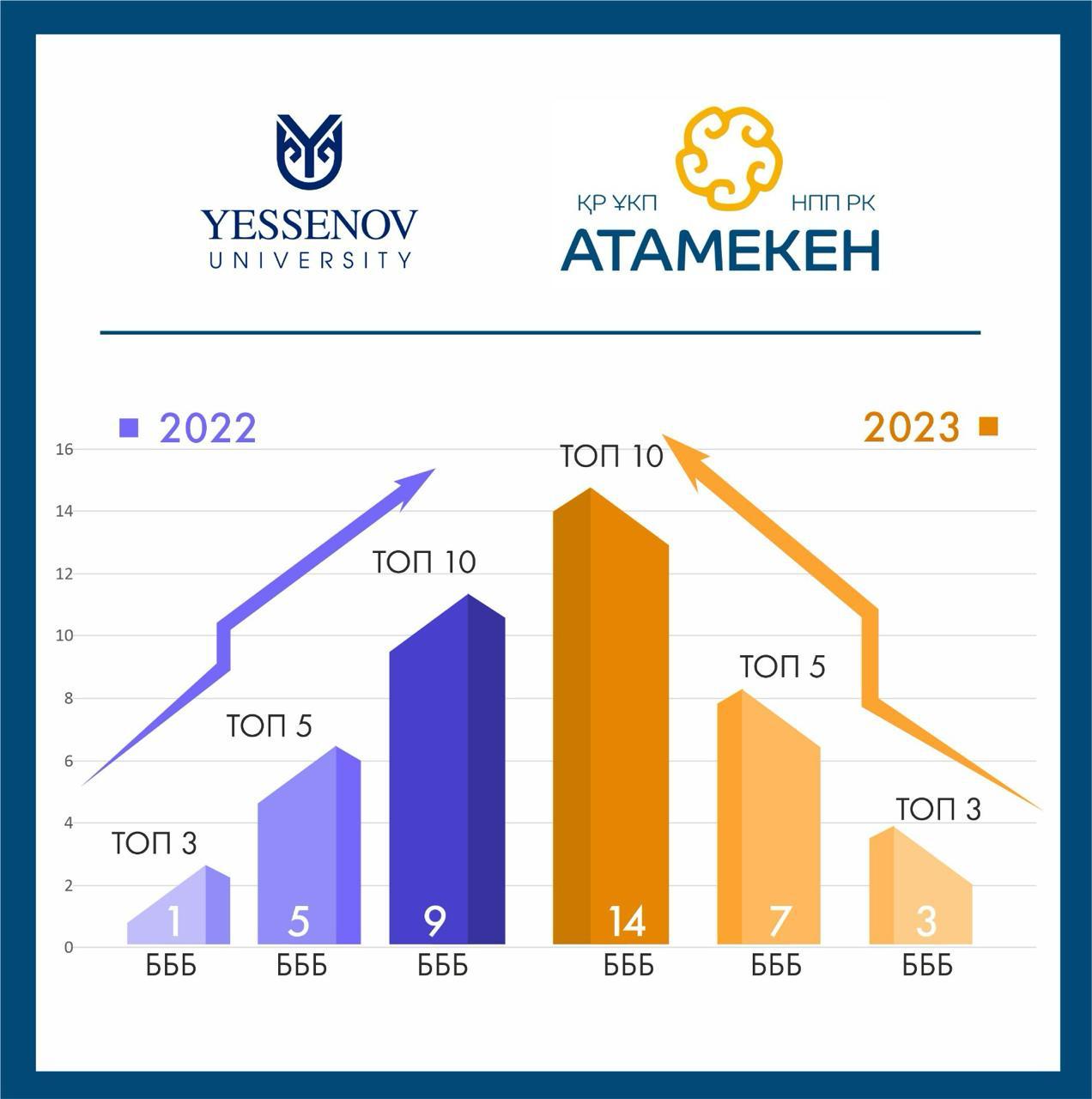 По сравнению с 2022 годом в ТОП-10 образовательных программ вошли 9 программ Yessenov University, в 2023 году в ТОП -10 вошли 14 образовательных программ нашего университета.