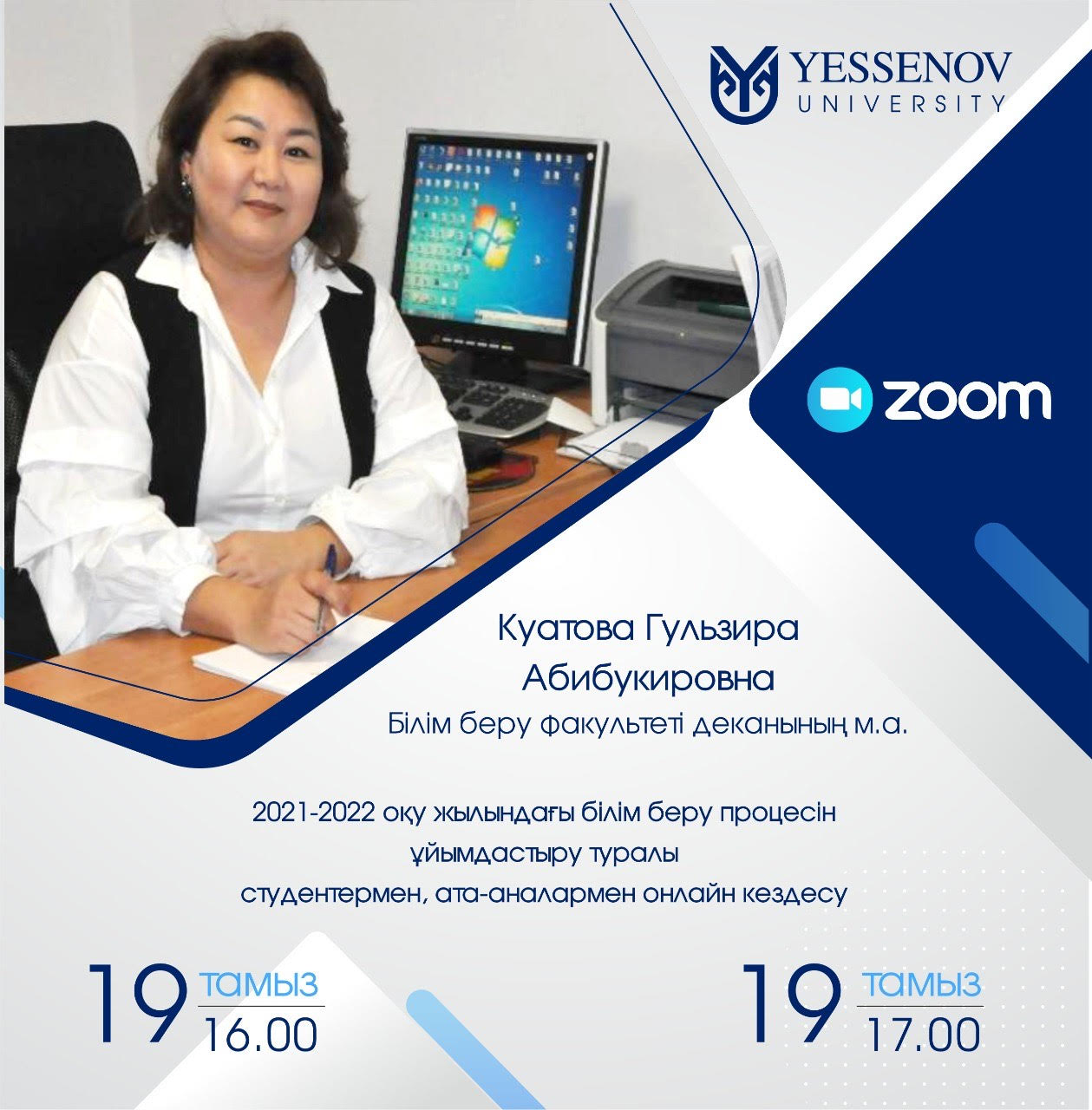 19 августа состоится встреча студентов и родителей факультета Образования с и.о. декана Куатовой Гульзирой Абибукировной.