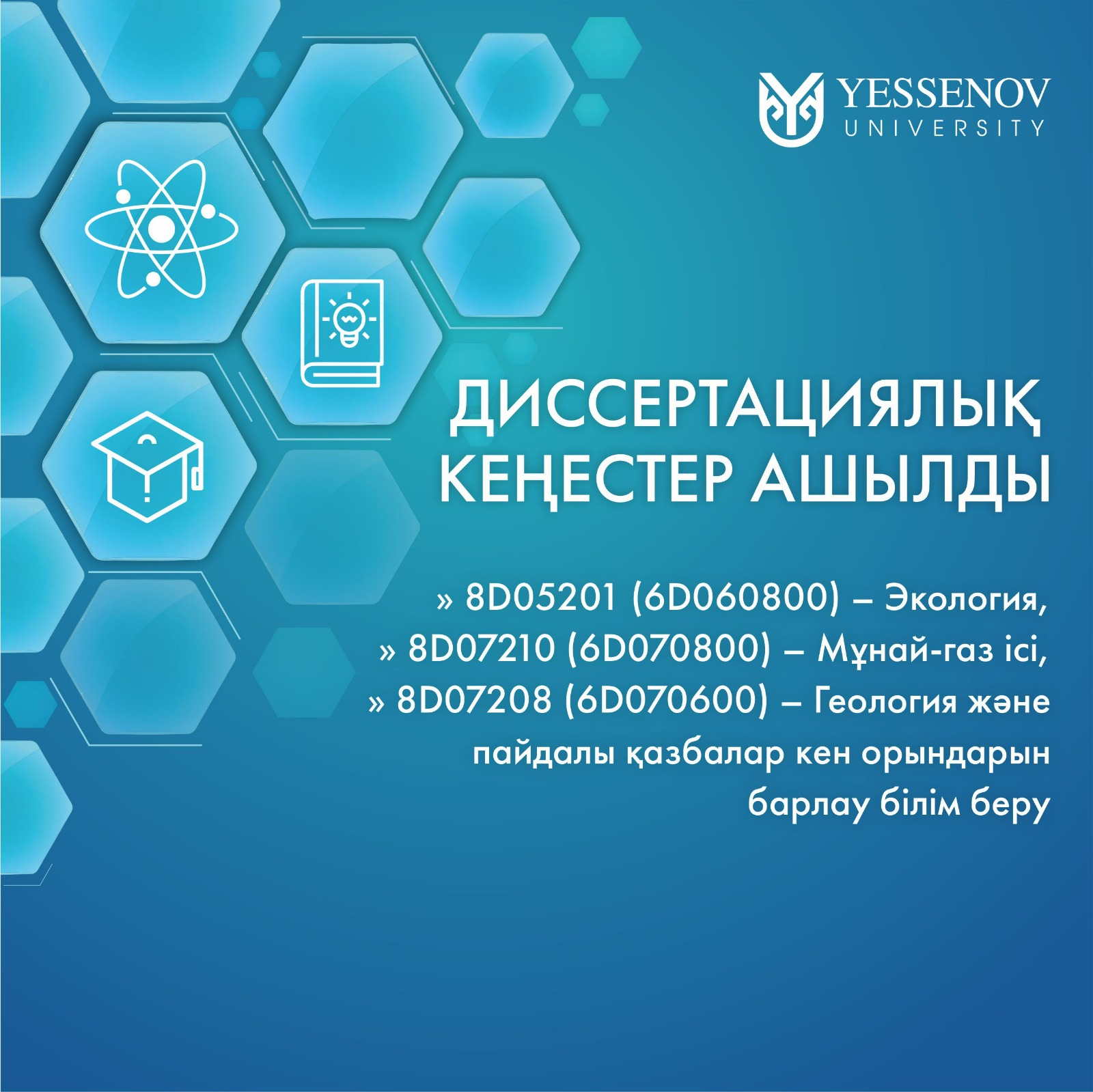 В соответствии с приказом Комитета по обеспечению качества в области науки и высшего образования Министерства науки и высшего образования Республики Казахстан от 29 марта 2023 года № 141 в Каспийском университете технологий и инжиниринга имени Ш. Есенова были открыты диссертационные советы по образовательным программам 8D05201 (6D060800) — Экология, 8D07210 (6D070800) — Нефтегазовое дело, 8D07208 (6D070600) – Геология и добыча полезных ископаемых разведки мест.