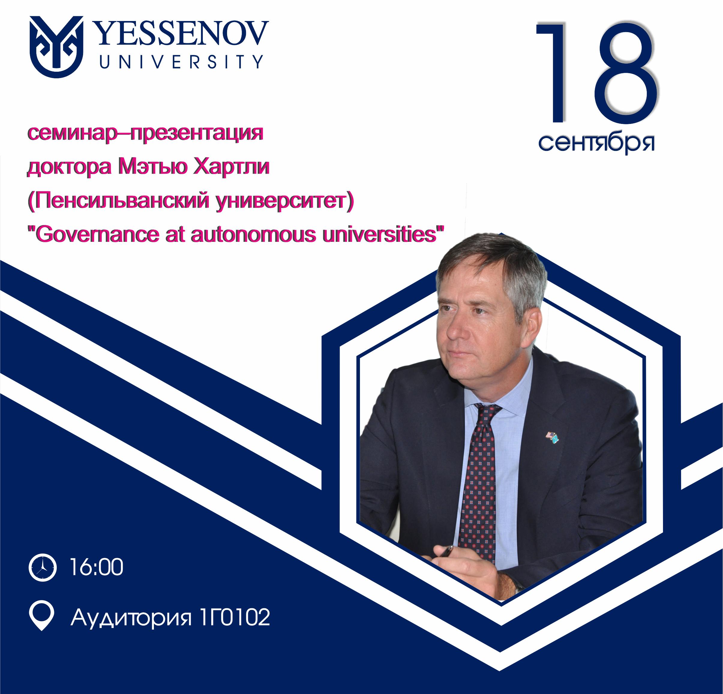 18 сентября в 16:00 в аудитории 1Г0102 главного корпуса Yessenov University пройдет семинар-презентация доктора Пенсильванского университета Мэтью Хартли на тему “Governance at autonomous universities” . Приглашаем студентов и преподавателей активно участвовать на данном мероприятии.