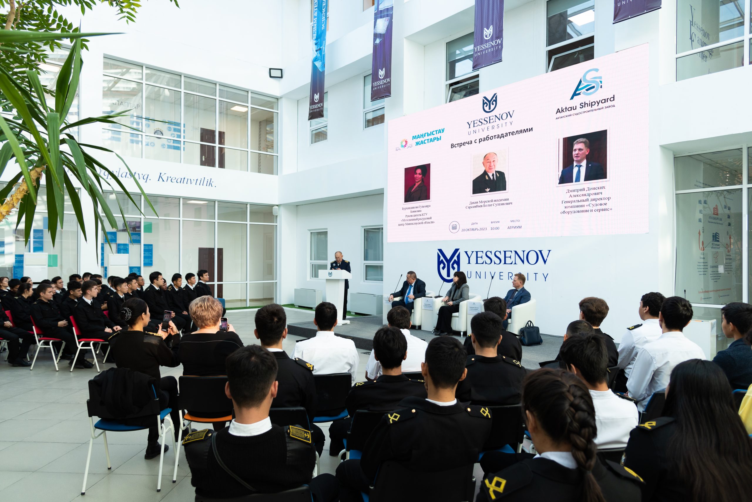 20 октября в Yessenov University в рамках продолжения реализации пунктов меморандума и соглашения о дуальном обучении состоялась встреча генерального директора ТОО «Судовая техника и сервис» Донских Дмитрия Александровича со студентами Морской Академии.