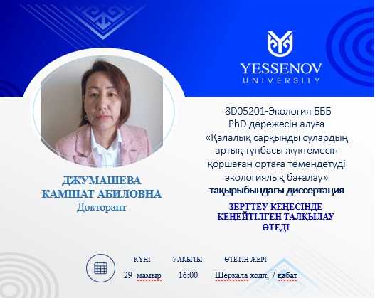 «8D05201(6D060800) – Экология» БББ бойынша РhD дәрежесін алуға Камшат Абиловна «Қалалық сарқынды сулардың артық тұнбасы жүктемесін қоршаған ортаға төмендетуді экологиялық бағалау» тақырыбындағы диссертациясынын Зерттеу кеңесінің кеңейтілген отырысында талқылауы өтеді.