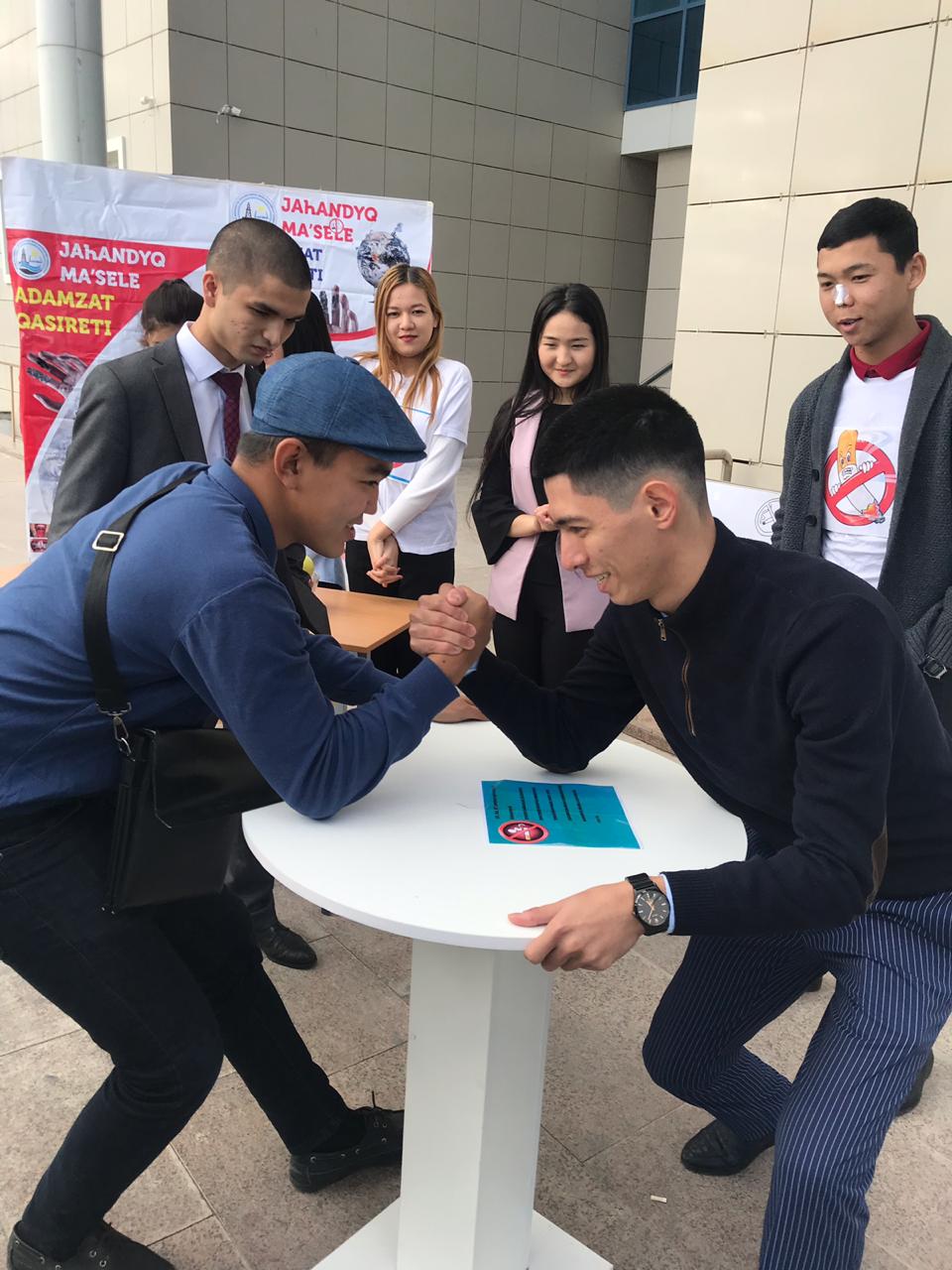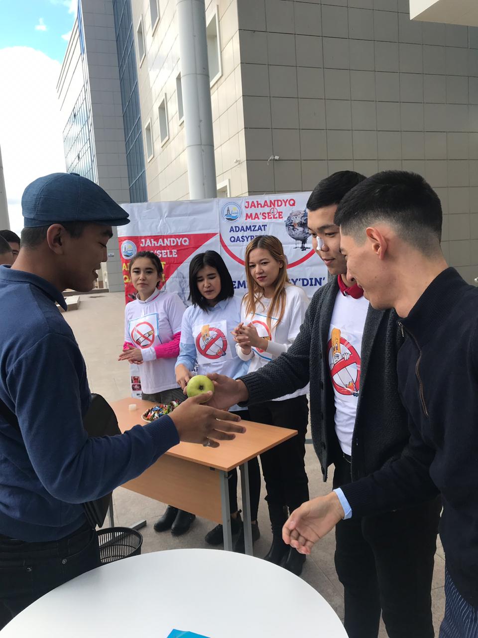 Во время акции студенты группы «Юриспруденция» предложили курящим студентам отказаться от табачных изделий и присоединиться к акции. Взамен были розданы сладости и фрукты, что намного полезнее для здоровья.
