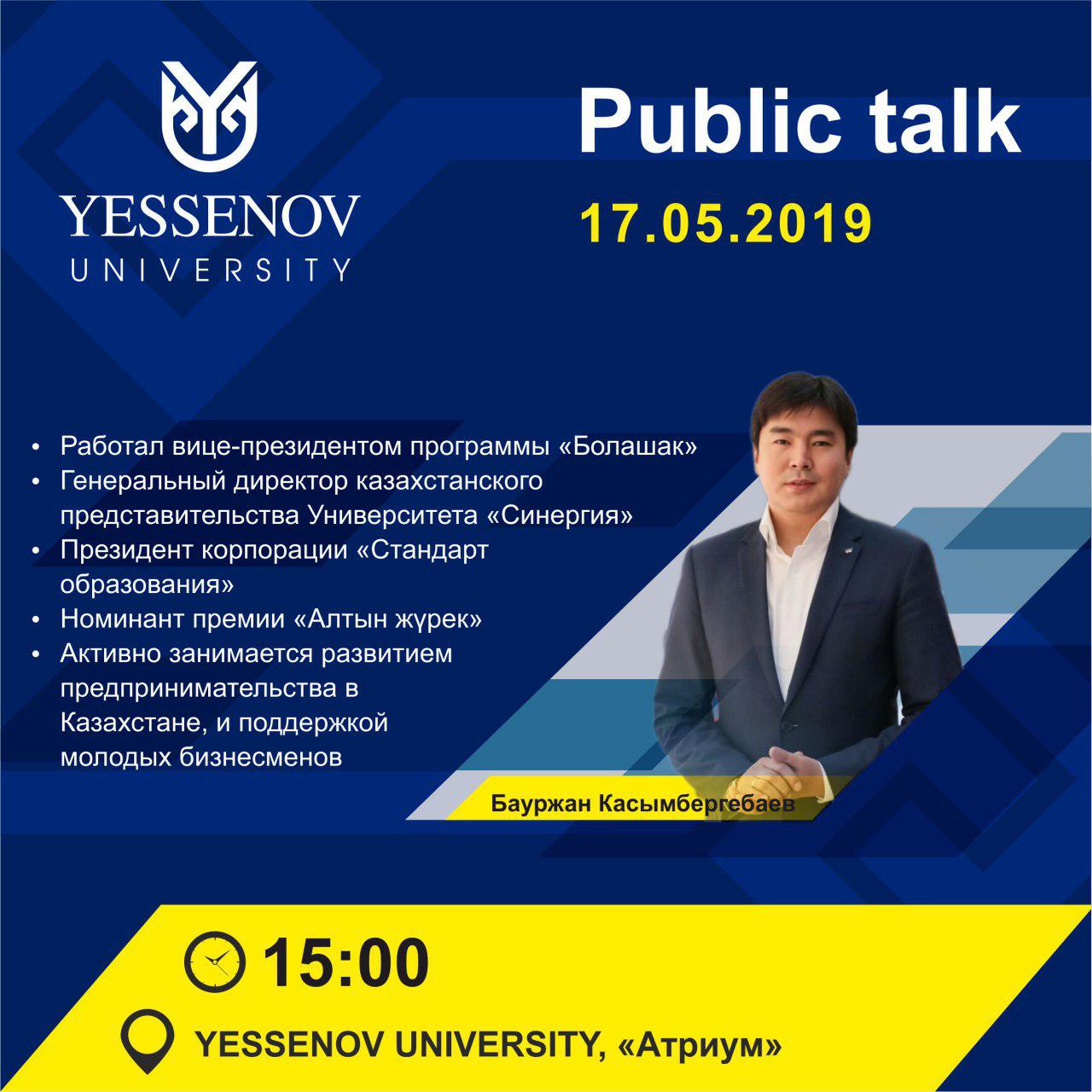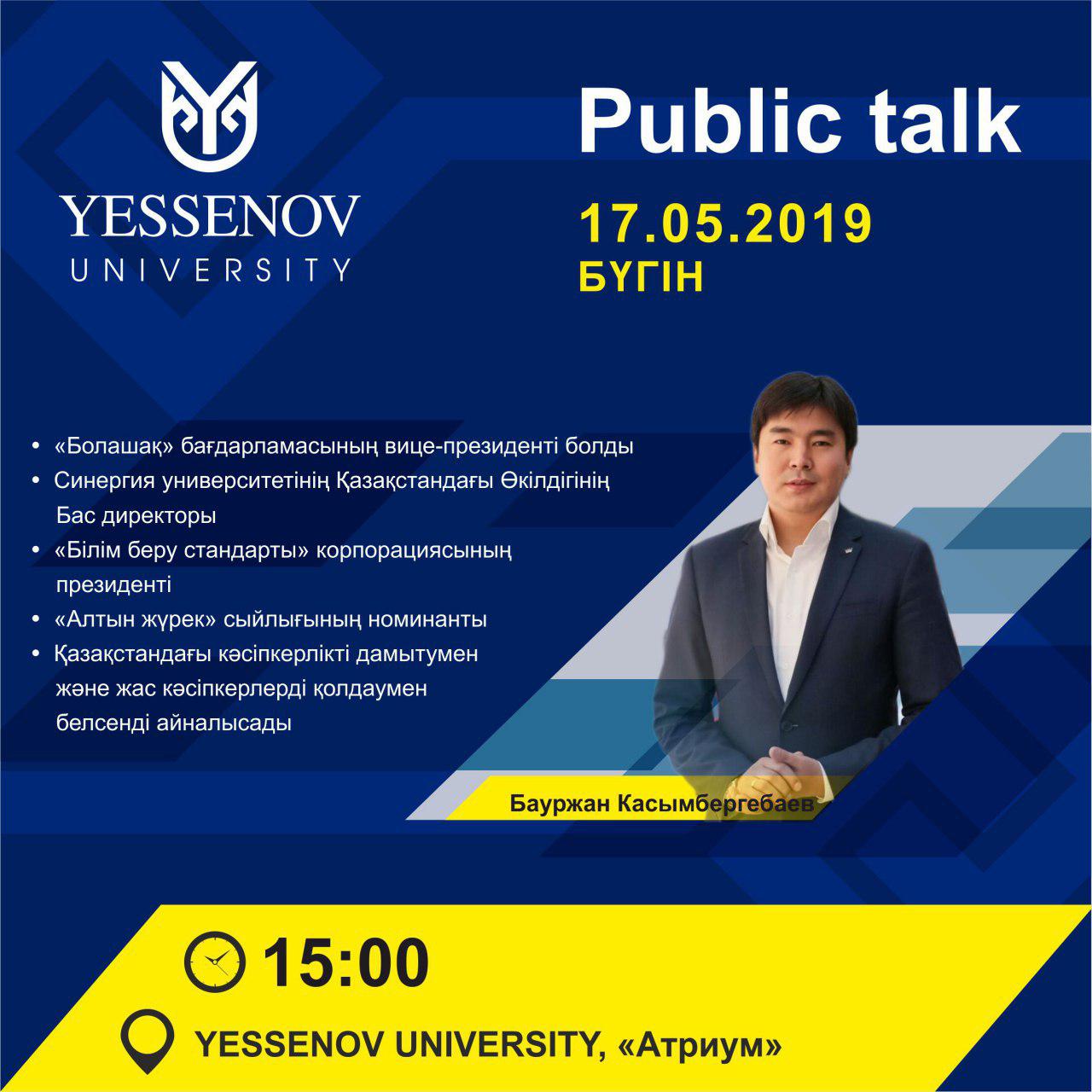 Сегодня, 17 мая в 15:00 в зале Атриум главного корпуса Yessenov University пройдет встреча с Президентом Университета «Синергия-Казахстан», предпринимателем, меценатом, мотиватором и ментором Бауржаном Касымбергебаевым.