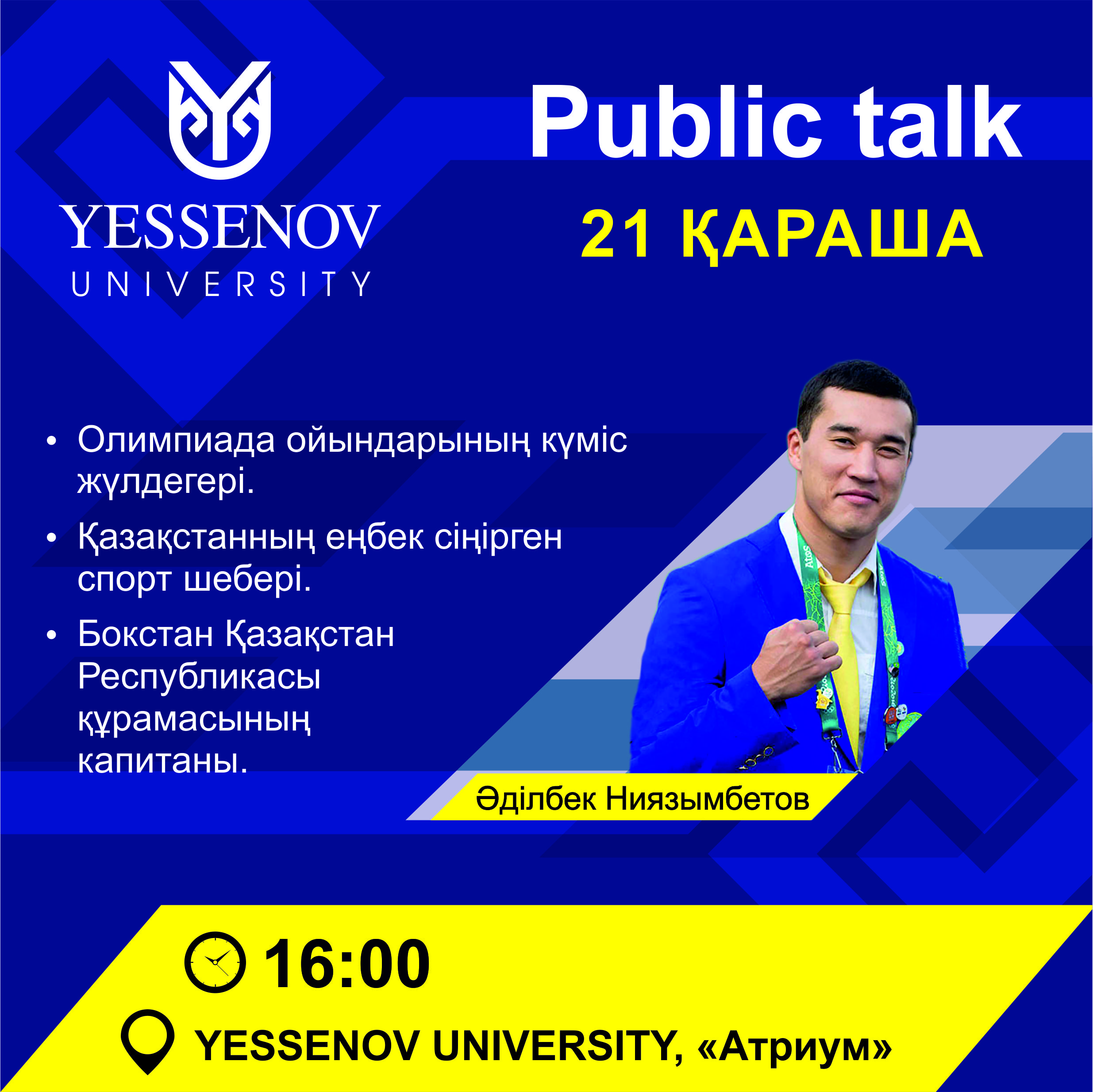 21 ноября в 16:00 в зале Атриум главного корпуса Yessenov University пройдет встреча с серебряным призером Олимпийских Игр, заслуженным мастером спорта Республики Казахстан, капитаном сборной Республики Казахстан по боксу Адильбеком Ниязымбетовым в рамках проекта #PublicTalk. Приглашаем студентов и преподавателей активно участвовать на данном мероприятии!