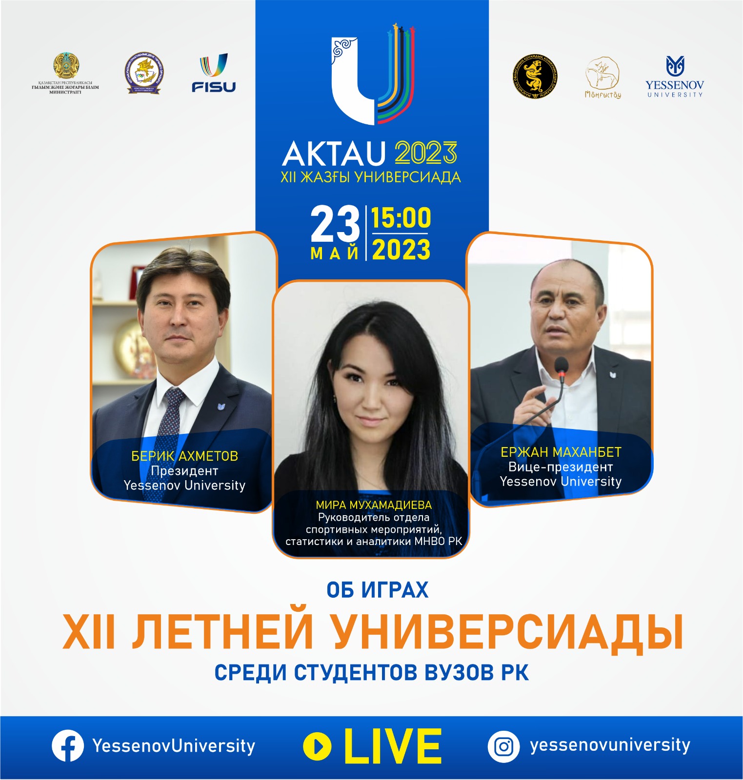 23 мая в 15:00 руководитель Управления спортивных мероприятий, статистики и анализа МОН РК Мира Мухамадиева, президент Yessenov University Берик Ахметов и вице-президент Yessenov University Ержан Маханбет выйдут в прямой эфир и ответят на все вопросы СМИ.