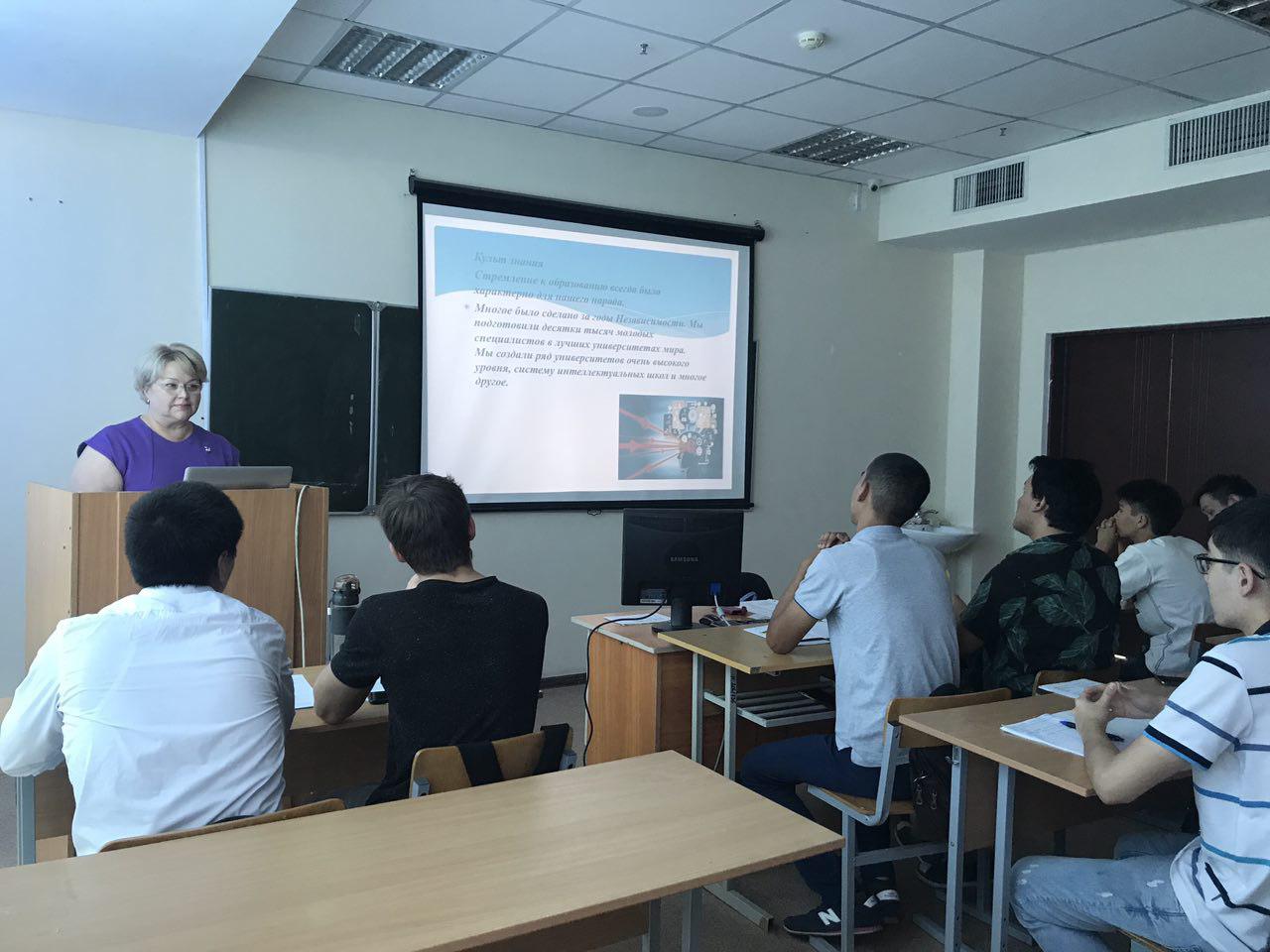 17 сентября состоялась лекция к.и.н., доцента кафедры «Ассамблея народов Казахстана» Буяновой Л.Л. для студентов 1-го курса Базового факультета групп «Информационные системы», «Электроэнергетика» на тему «Духовное обновление -взгляд в будущее: модернизация общественного сознания. Преподаватель познакомила студентов c основными положениями статьи Главы Государства Н.А. Назарбаева, направленные на модернизацию общественного сознания. Сохранить и приумножить духовные и культурные ценности — вот основная цель работы по программной статье президента «Духовное обновление -взгляд в будущее». Программа «Духовное обновление» — это новый подход к решению задач. Взгляд в будущее — это модернизация общественного сознания. Президент в своей статье возлагает большие надежды на молодое поколение, которому строить новое будущее страны. Студенты в ходе лекции принимали активное участие в обсуждении вопросов.
