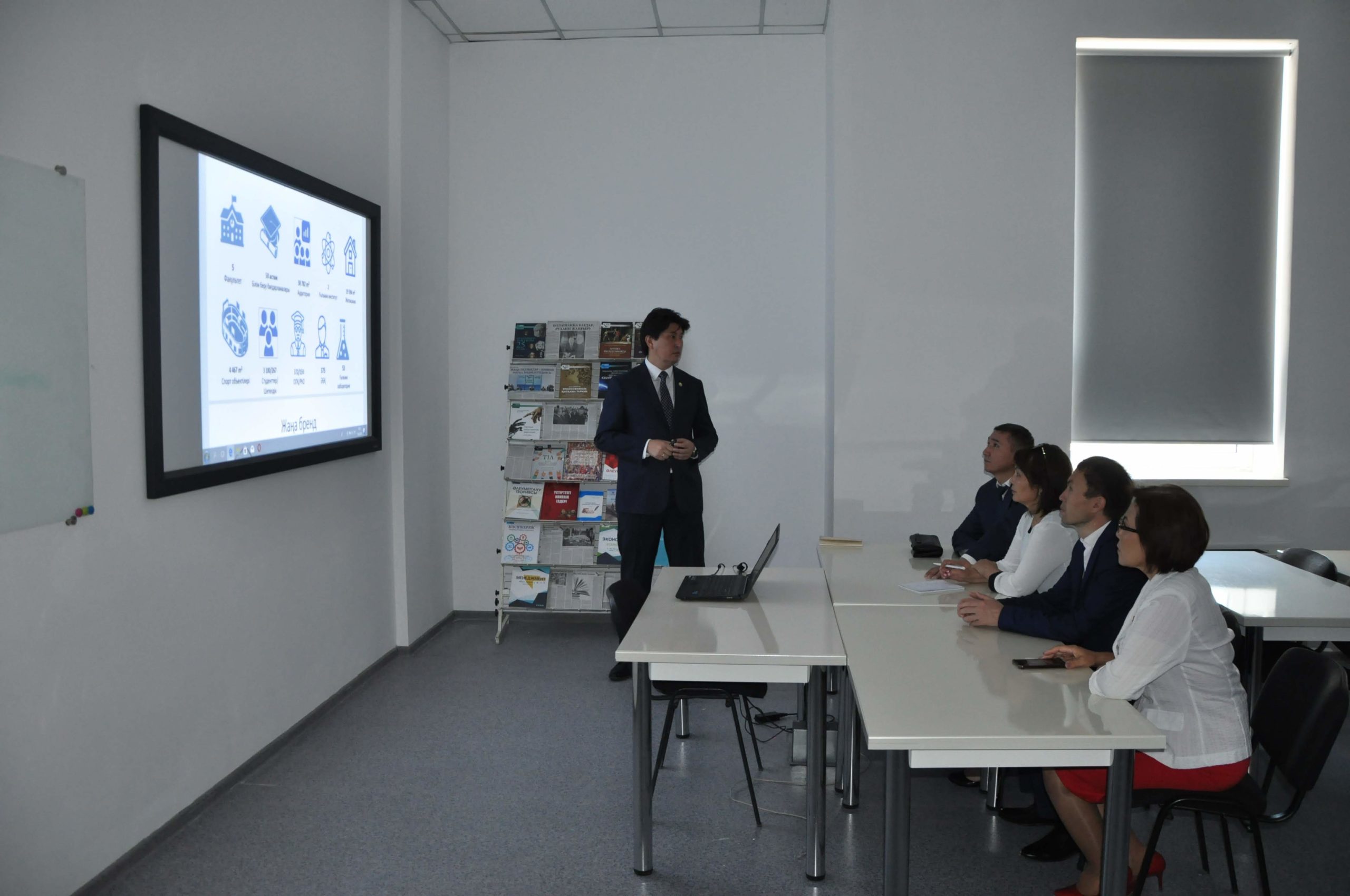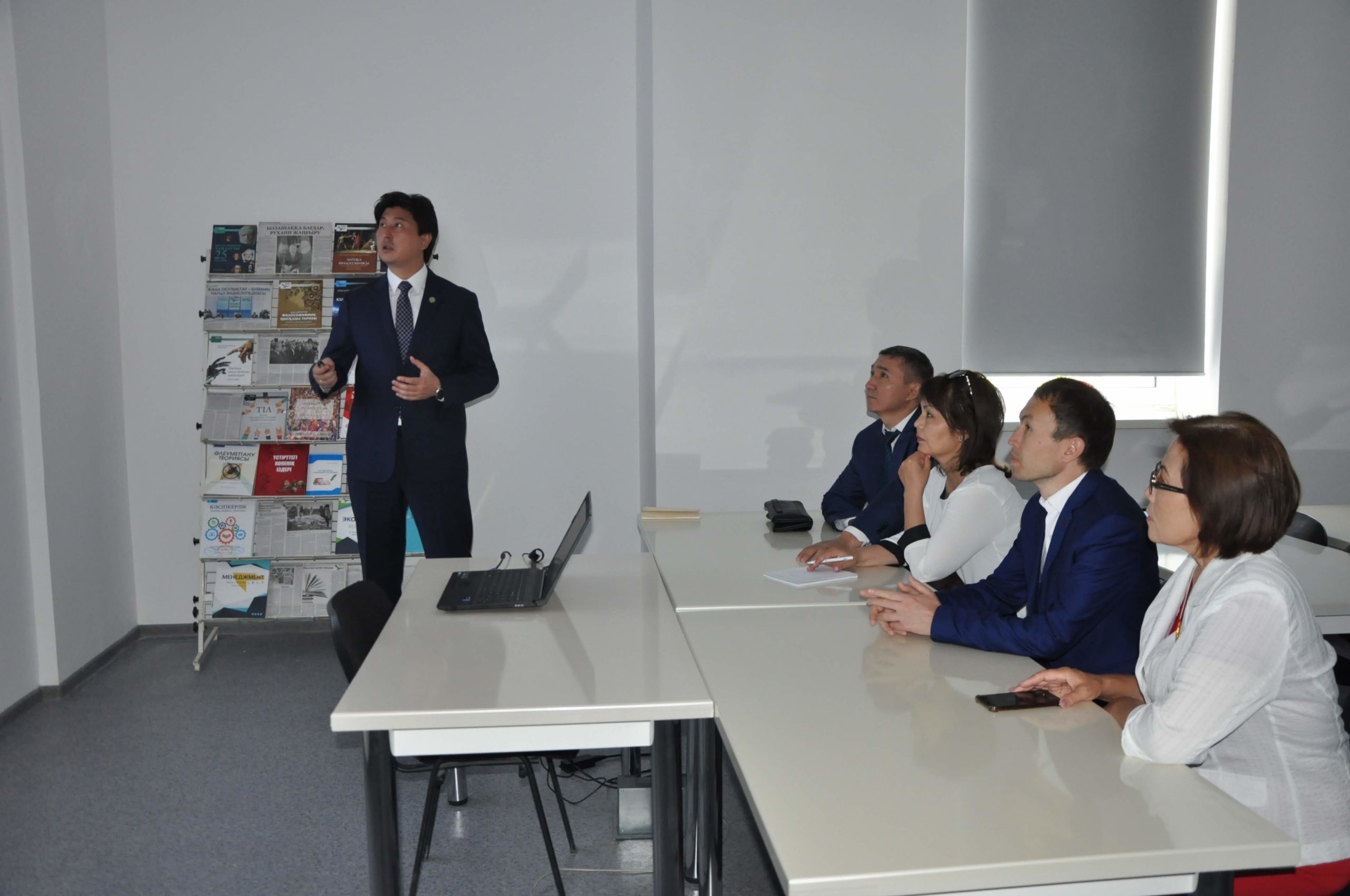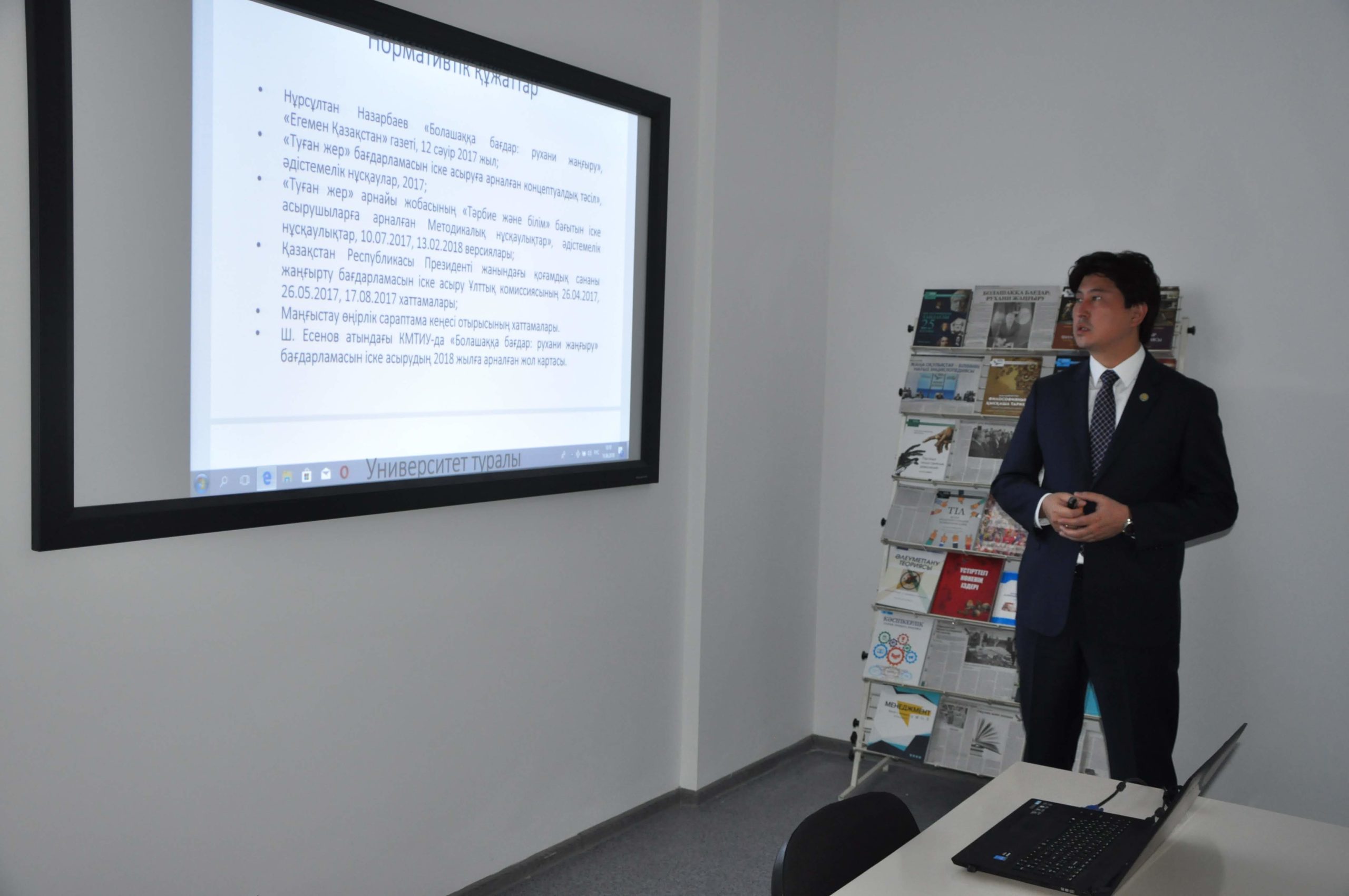 Ректор университета Ахметов Берик Бакытжанович в кабинете «Рухани жаңғыру» презентовал и подробно рассказал о проводимых и планируемых работах в университете в рамках реализации программы «Рухани жаңғыру». Гости ознакомились библиотекой университета, учебным корпусом.
