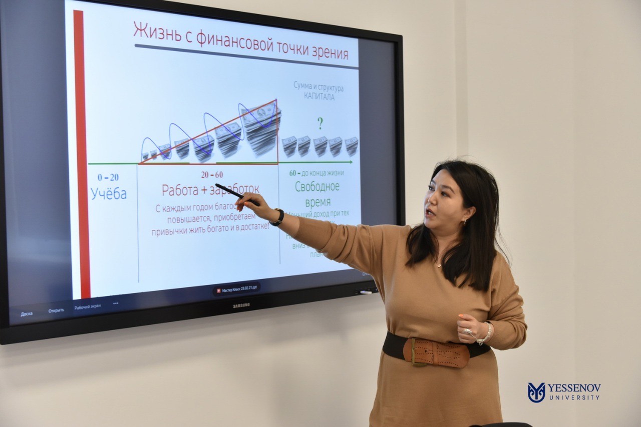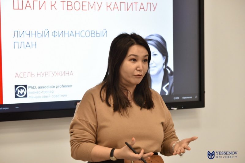 24 февраля года в Yessenov University была организована встреча студентов факультета “Бизнес и право” с CEO бизнес-тренером, коуч-спикером, PhD Асель Нургужиной на тему «Шаги к твоему капиталу».