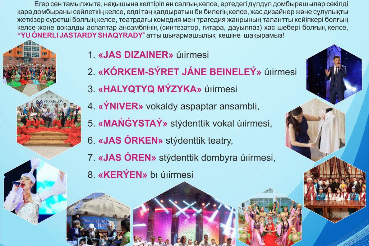 Если ты хочешь красиво петь, искусно играть на домбре, удивлять страну своими танцами, стать молодым дизайнером или художником, талантливым героем жанра комедии и трагедии в театре или мастером ансамбля вокальных инструментов (синтезатор, гитара, дауылпаз), добро пожаловать на вечер “YU ÓNERLI JASTARDY ShAQYRADY”!
