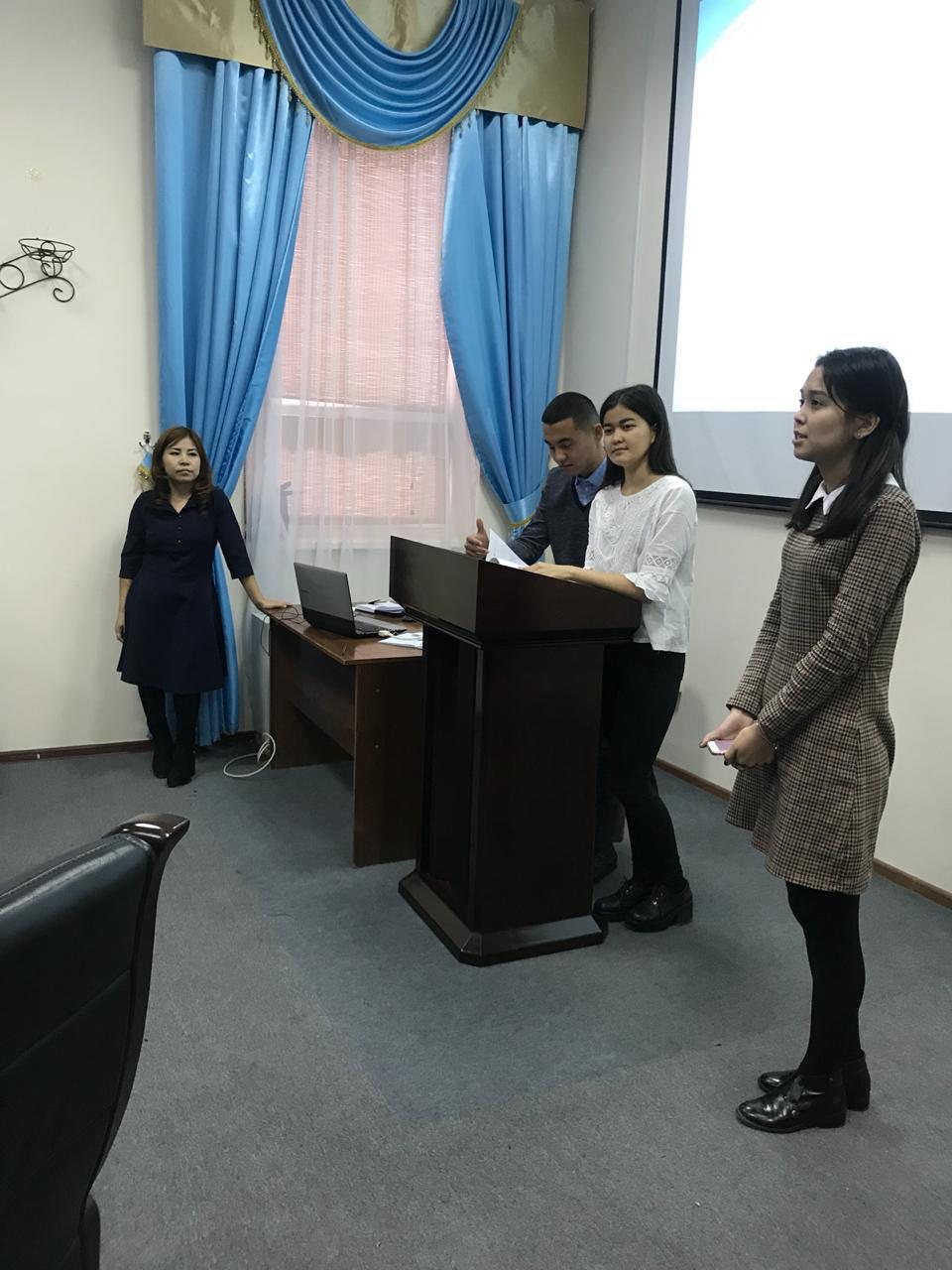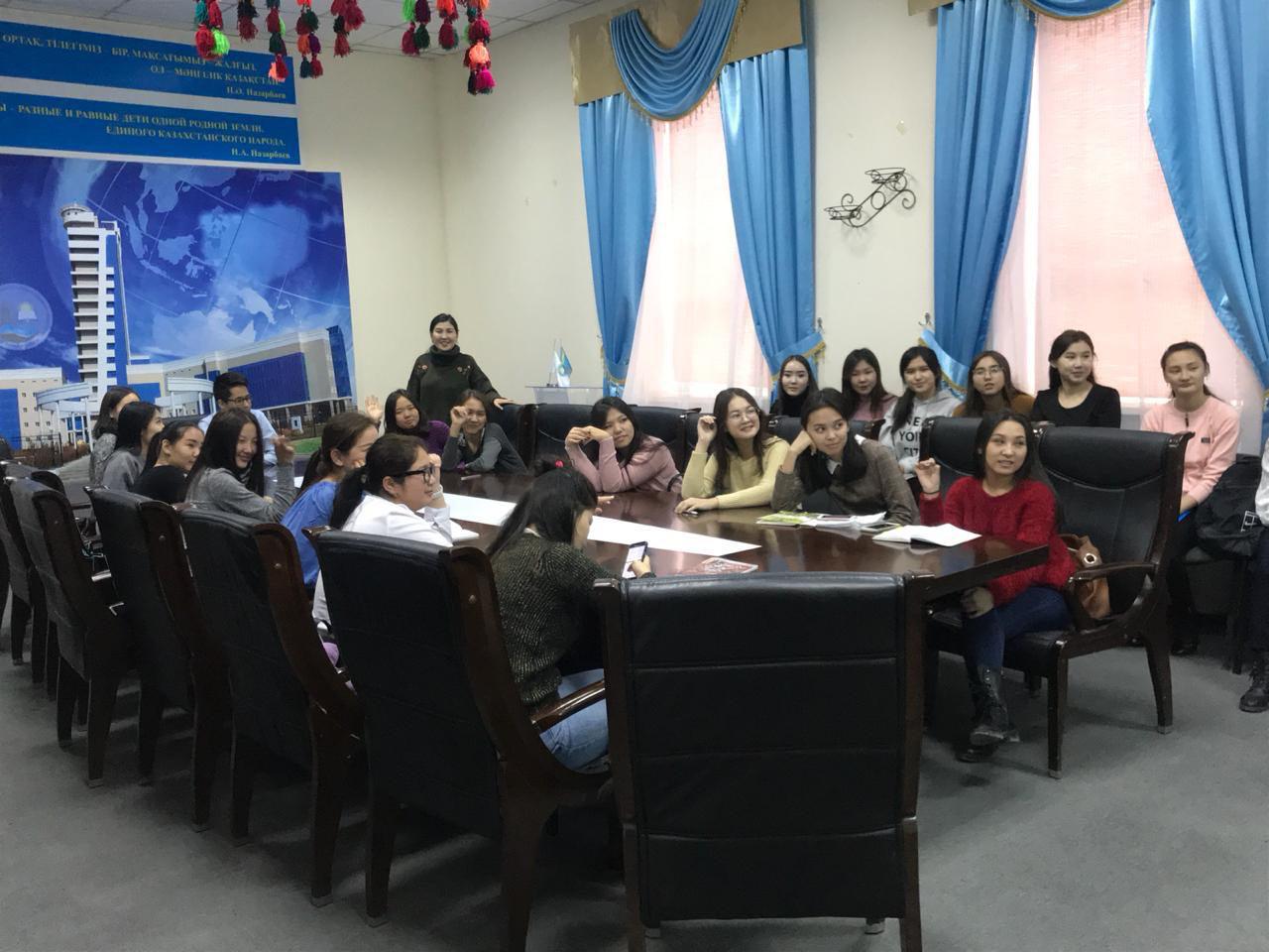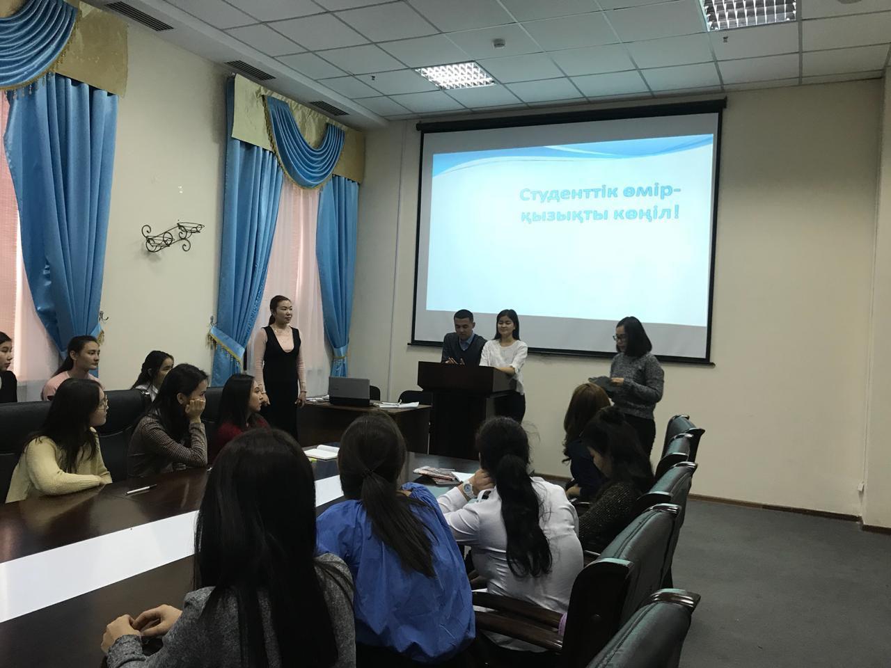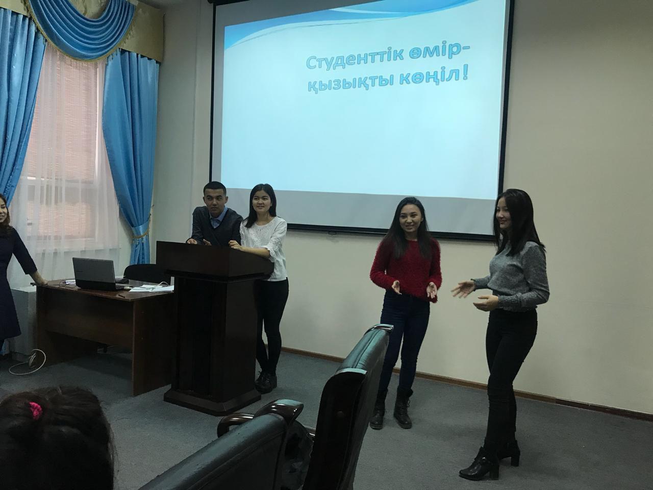 Преподаватели кафедры Ассамблея Народа Казахстана Токбаева Л.К., Толепбергенова А.Б. провели воспитательный час на тему:«Студенттік өмір-қызықты көңіл!» среди студентов 1 курса группы «Учет и аудит». Мероприятие было организовано в честь предстоящего праздника студентов. Цель воспитательного часа: ознакомить студентов с историей праздника, научить студентов к поискам, умению реагировать на вопросы, находчивости, воспитывать активность, разносторонность, рациональное использование времени, избегать вредных привычек. В ходе мероприятия студенты узнали об истории празднования Дня студентов, читали стихи, пели песни, играли в игры, исполняли различные ситуационные задачи.