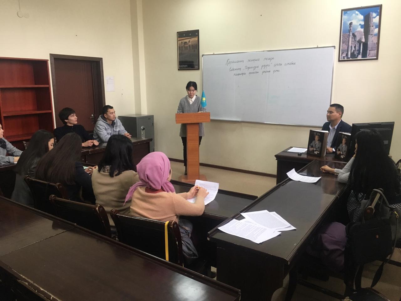 Цель встречи: формирование у студентов гражданской позиции, воспитания казахстанского патриотизма, стремления к осознанному гармоничному духовно-нравственному развитию.