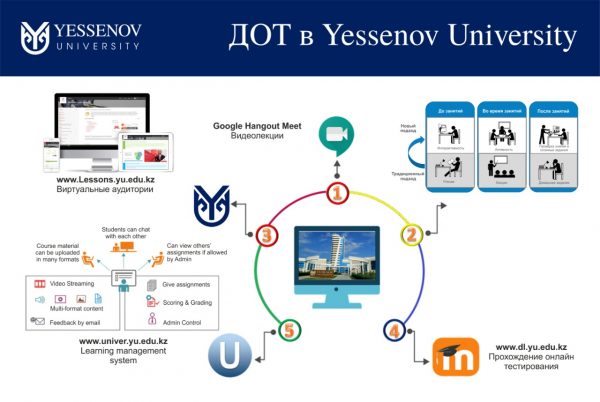 Online занятия проводятся по средствам сервиса Google Hangouts Meet. В Yessenov University разработан сайт (lessons.yu.edu.kz) с виртуальными аудиториями, где студенты и ППС в установленное время, согласно утвержденному расписанию, входят в виртуальную аудиторию и проводят online занятие.