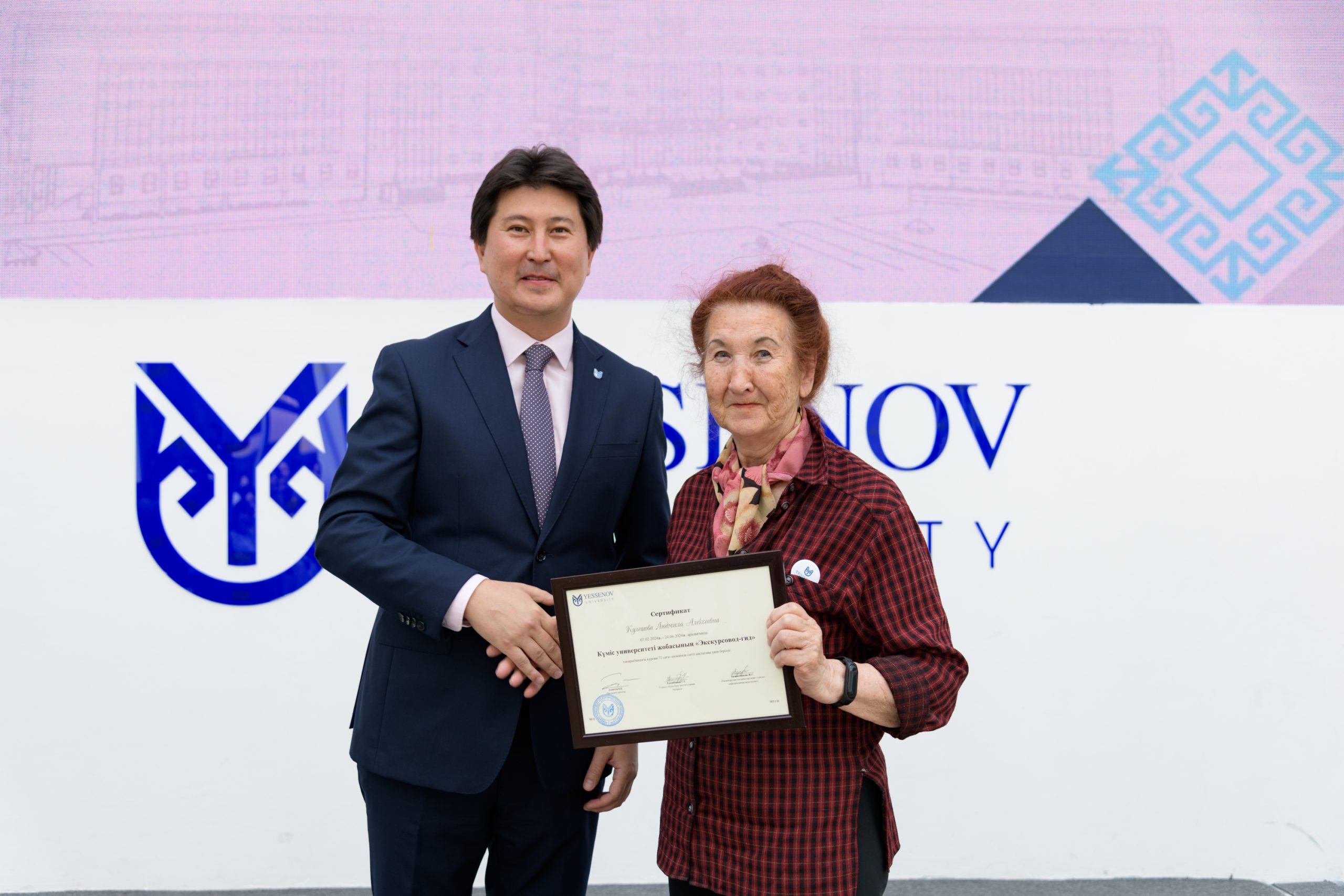 Именные сертификаты для каждого участника Интегрированного туристского курса по подготовке гид-экскурсоводов вручал Президент — ректор Yessenov University Ахметов Берик Бахытжанович. С поздравительной речью выступил главный специалист Отдела индустрии туризма Управления туризма Мангистауской области Жайылханов Абылайхан Нурадинович. Свою благодарность от имени слушателей выразили 83-летний пенсионер Кокимбаев Туркменбай и 65-летняя Гусеинова Галина Александровна. Представители элегантного возраста успешно завершили обучение и рассказали, что на заслуженном отдыхе они снова смогли сесть за парту и получить знания по IT -технологии, обучиться компьютерной грамотности и работе с мессенджерами, английскому языку, сакральным местам и этнографии Мангистау.