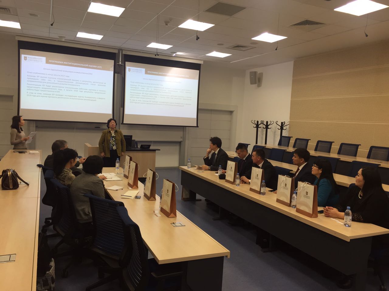 Nazarbayev University студенттер жұмысы мен халықаралық ынтымақтастық бойынша вице-президенті Қадиша Даировамен және университет ғалымдарымен кездесу ұйымдастырылды. Кездесу барысында Назарбаев Университетінің стратегиялық мақсаттары мен жұмыс жасау принциптері, адам ресурстарын басқару және университеттің құзыреттілік моделі туралы баяндап, тәжірибелерімен алмасты. Сонымен қатар, Yessenov University өкілдері Nazarbayev University бірқатар ғылыми-зерттеу зертханаларымен және материалдық-техникалық базасымен танысты. Кездесуді қорытындылай келе бір топ ғалымдардың қатысуымен төмендегідей ұсыныстар талқыланды: