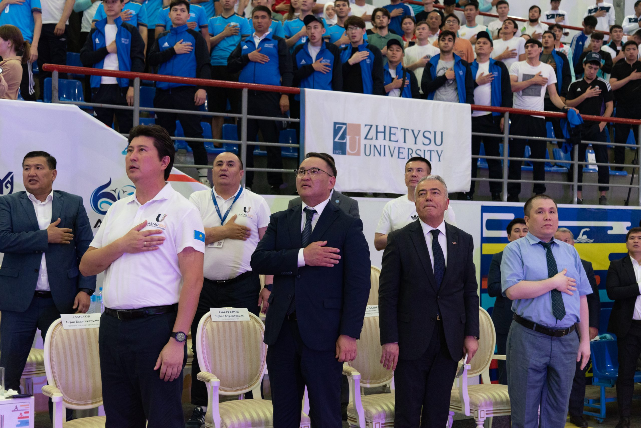 Флаг Всемирной Универсиады вывели чемпионы мира, чемпионы мира, мастера спорта международного класса Yessenov University М. Каналиева, Ж. Сторкбай, Н.Галымбекулы, О. Алтынбек. Церемония поднятия флага Универсиады прошла особенно впечатляюще. Праздничный вечер продолжился концертной программой.