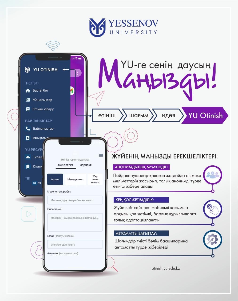 Yessenov University студенттері мен қызметкерлері үшін жаңа «YU Otinish» электронды жүйесі іске қосылды. Бұл инновациялық платформа университет қауымдастығына оқу процесі, инфрақұрылым, қызмет көрсету сапасы және басқа да мәселелер бойынша өз ұсыныстарын немесе шағымдарын тиімді жеткізуге мүмкіндік береді.