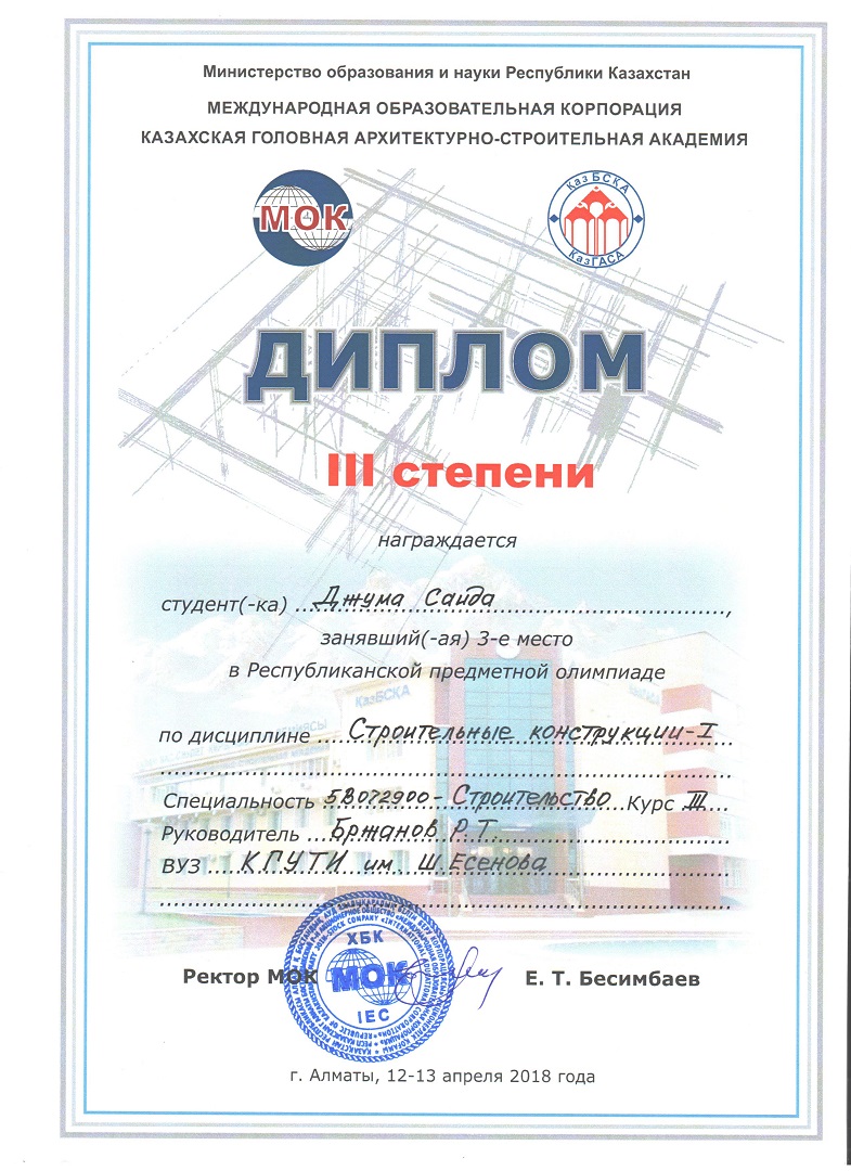 Yessenov University атынан «Құрылыс» мамандығының 3 – курс студенттері Джума  Сайда,  Қалдыбай Аблайхан және Шамшеденов  Нұрбек   қатысып, жоғары білімі мен біліктілігін көрсетті.